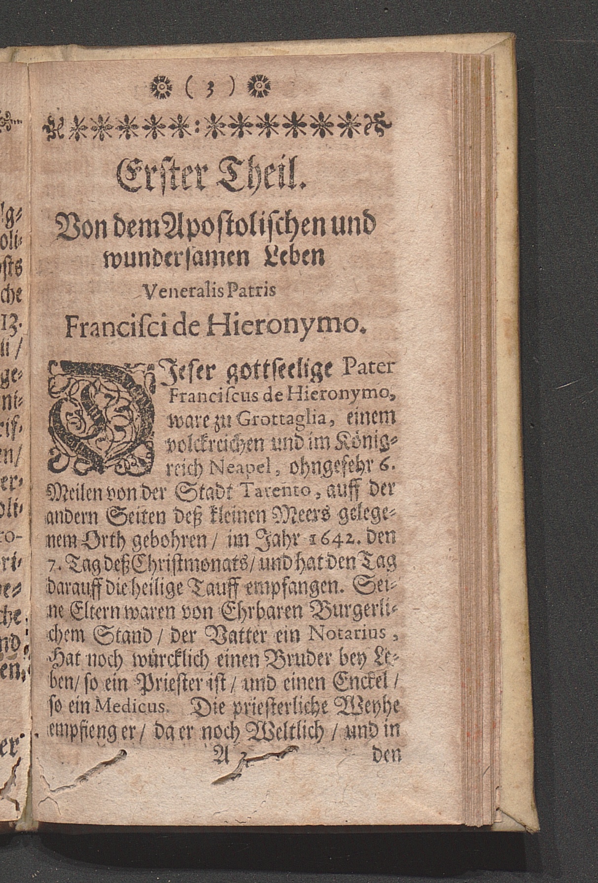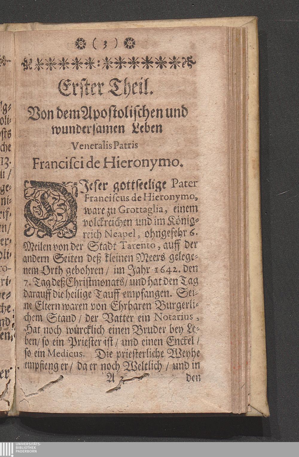 Vorläuffiger Kurtzer Bericht/ Von dem Apostolischen Lebens-Wandel/ und Wundersamen Thaten Venerabilis Patris Francisci De Hieronymo Auß der Gesellschafft Jesu/ Welcher den 11. May dieses lauffenden 1716. Jahrs zu Neapel im Profeß-Hauß gemelter Societät mit sonderem Ruff der Heiligkeit verschieden : Auß unterschidlichen Jtaliänischen Send-Schreiben/ welche bishero von Neapel/ Rom/ und andern Orthen ankommen seynd zusamen gezogen/ Jn das Teutsche übersetzt/ und ... in Truck gegeben