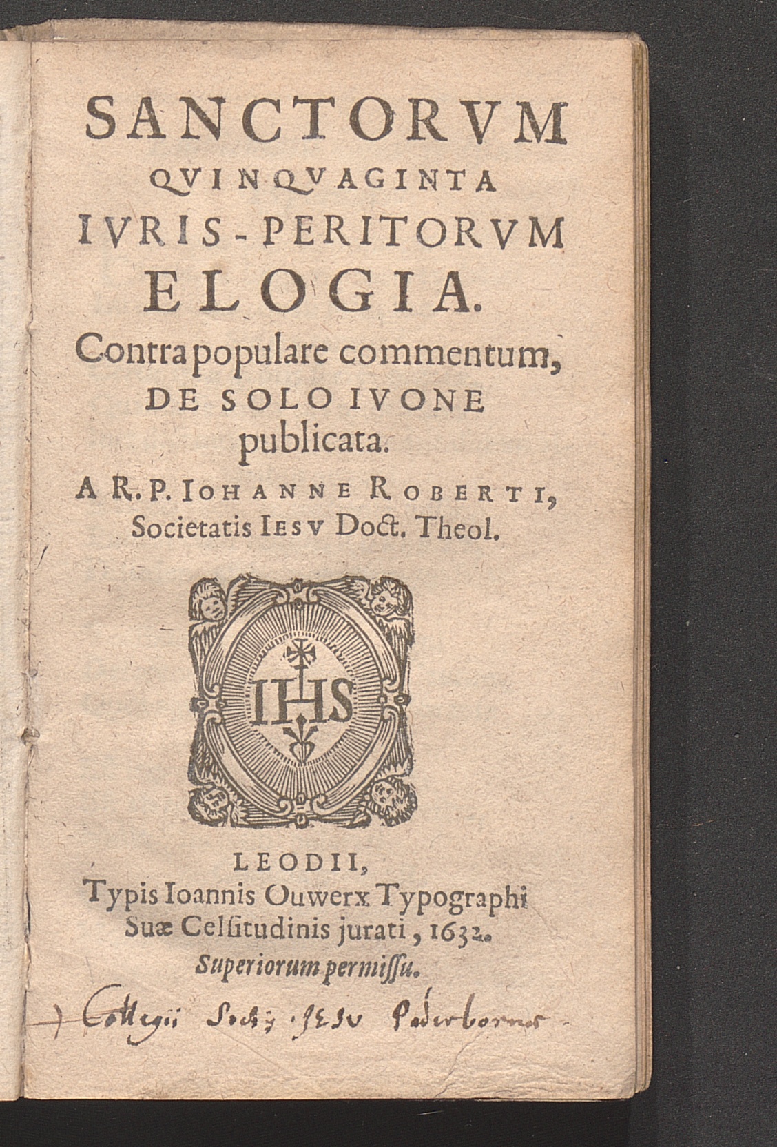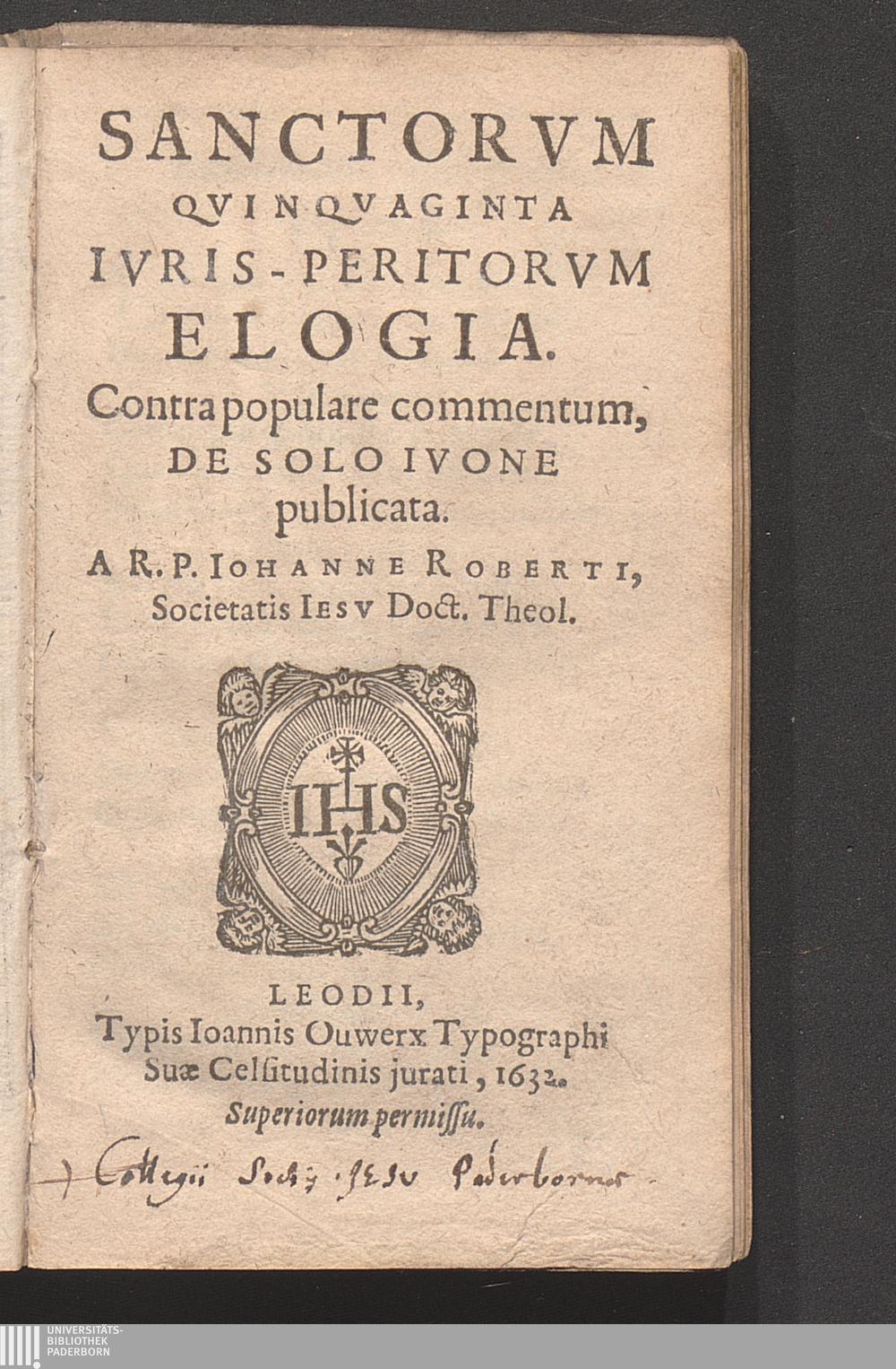 Sanctorvm Qvinqvaginta Ivris-Peritorvm Elogia / Contra populare commentum, De Solo Ivone publicata. A R. P. Iohanne Roberti, Societatis Iesv Doct. Theol.