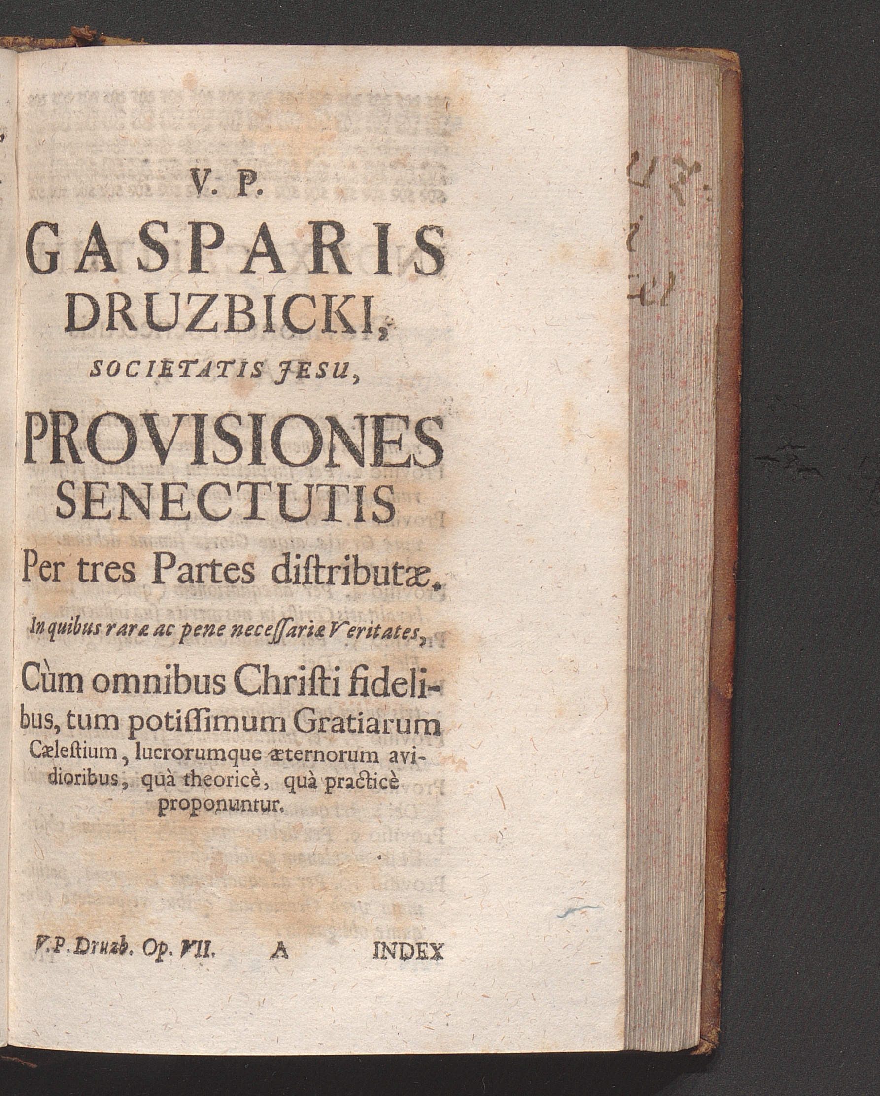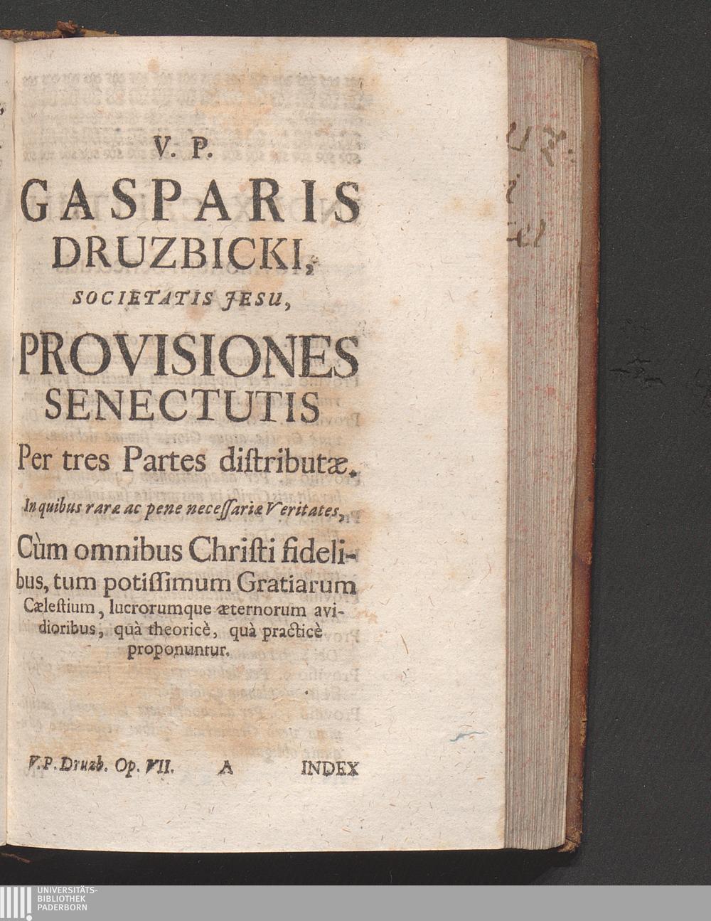 [7] (1732) V. P. Gasparis Druzbicki, Societatis Jesu, Provisiones Senectutis, Per Tres Partes Distributæ : In quibus raræ ac penenecessariæ Veritates, cum omnibus Christi fidelibus, tum potissimùm Gratiarum Cœlestium, lucrorumque æternorum avidibus, quà theoreticè, quà practicè proponuntur