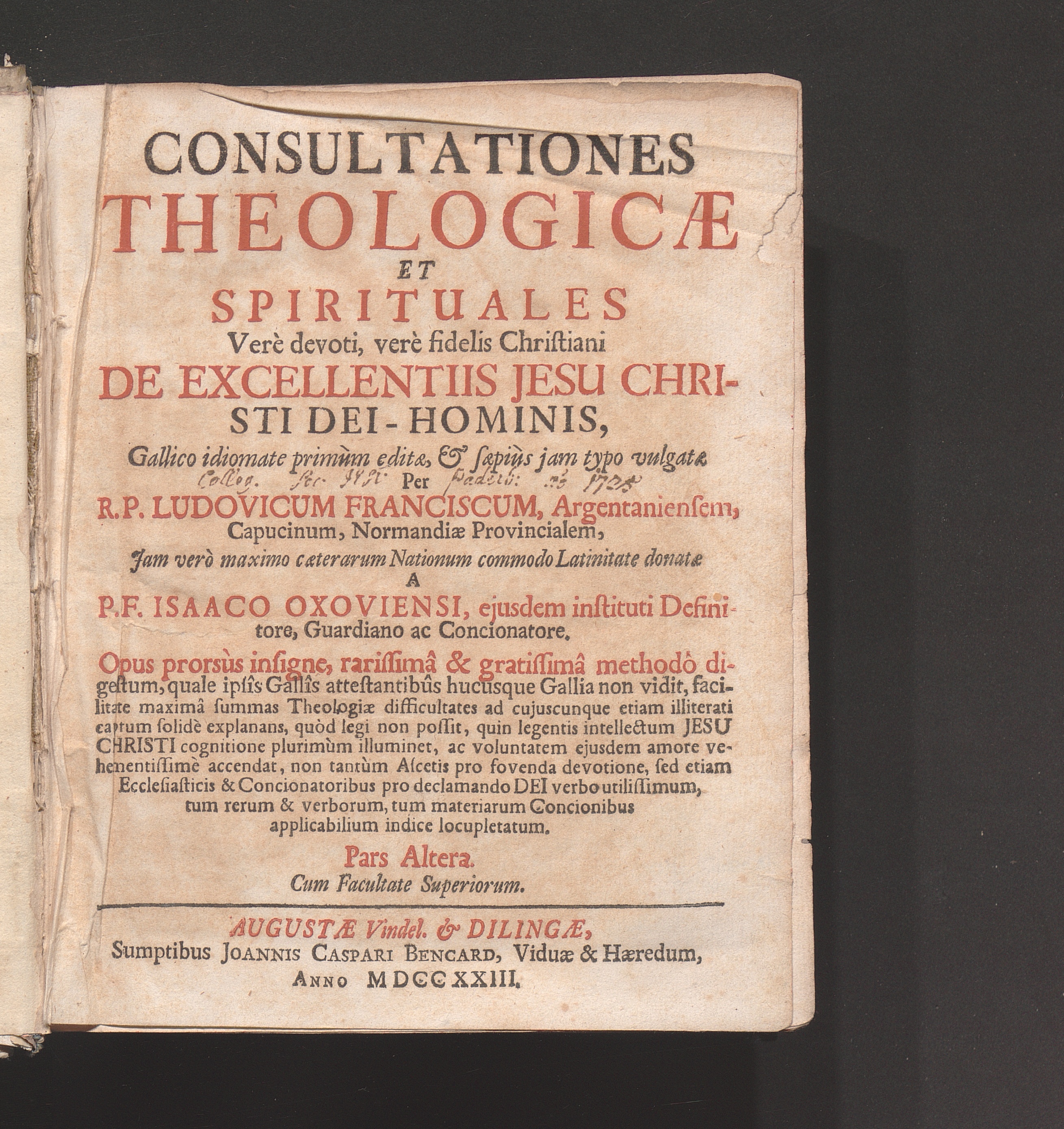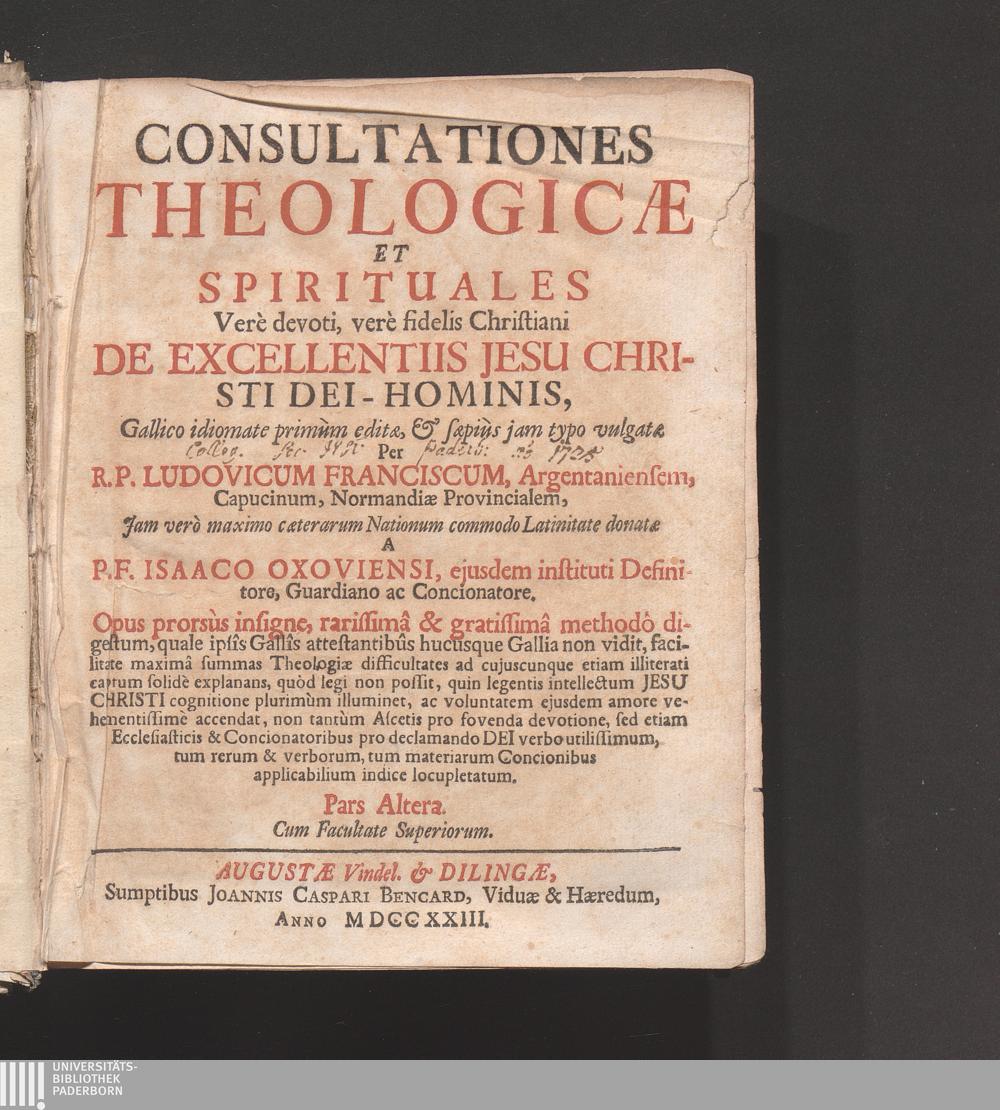 Pars Altera (1723) ... De Excellentiis Jesu Christi Dei-Hominis