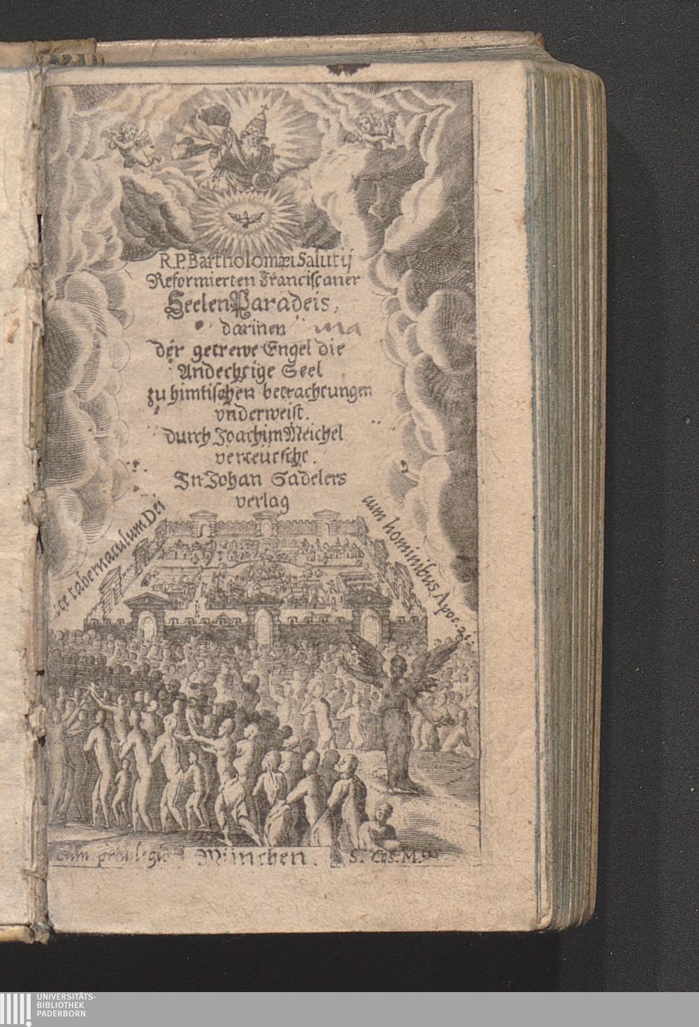 R. P. Bartholomæi Salutij Reformierten Franciscaner SeelenParadeis : darinen der getrewe Engel die Andechtige Seel zu himlischen betrachtungen vnderweist / durch Joachim Meichel verteutscht