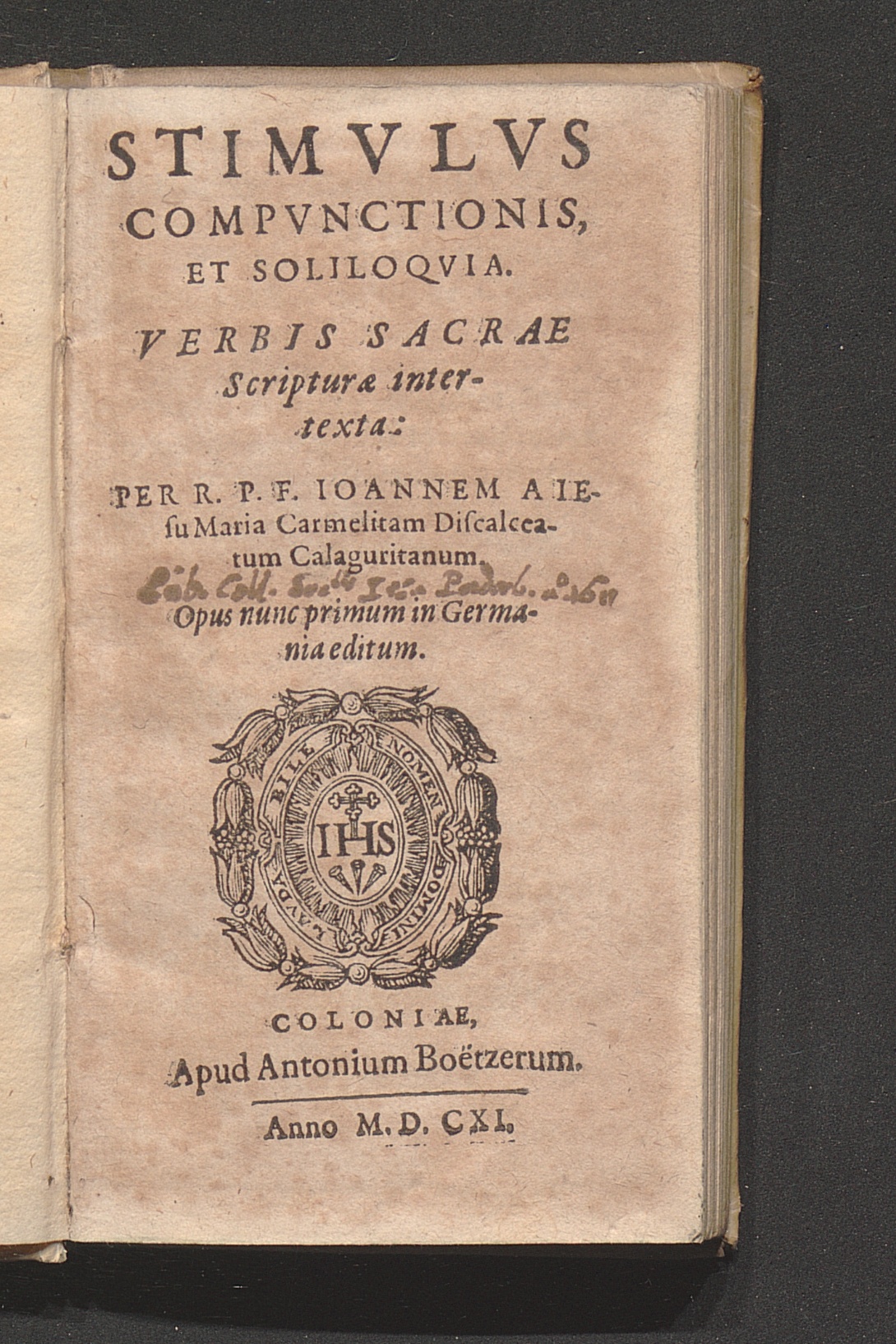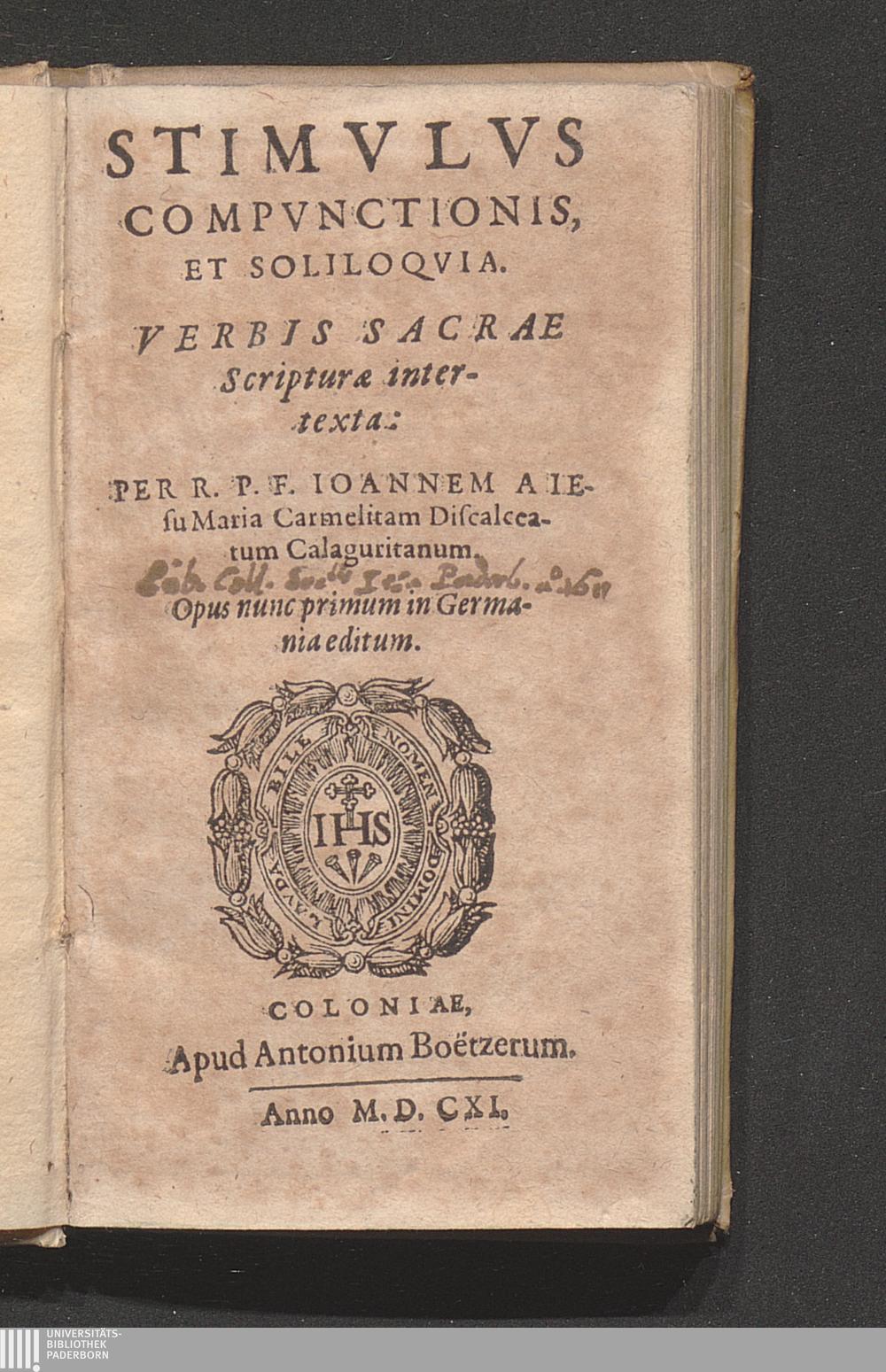 Stimvlvs Compvnctionis, Et Soliloqvia : Verbis Sacrae Scripturæ intertexta / Per R. P. F. Ioannem A Iesu Maria Carmelitam Discalceatum Calaguritanum