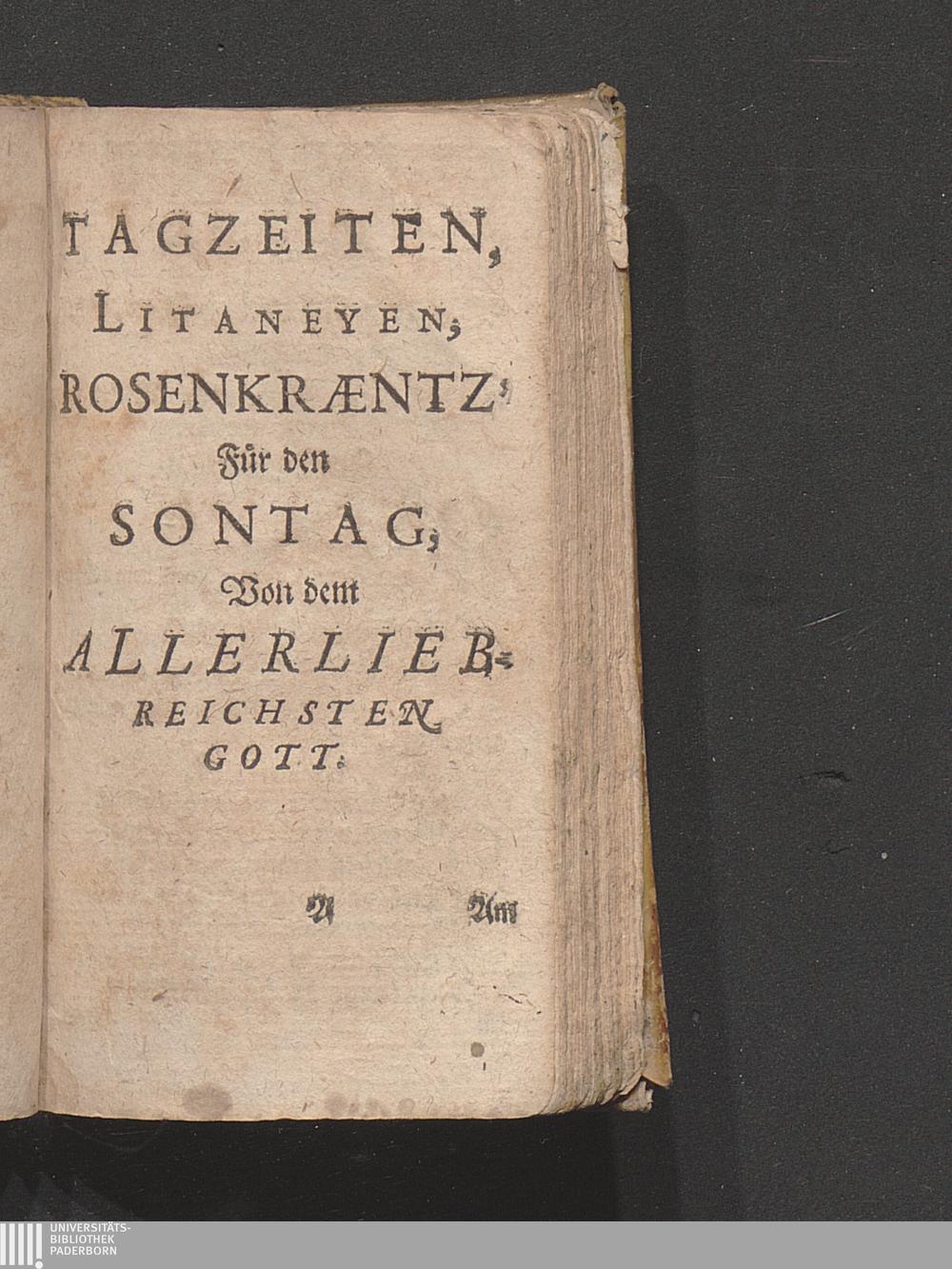 Tagzeiten, Litaneyen, Rosenkræntz Für den Sontag, Von dem Allerliebreichsten Got[...]