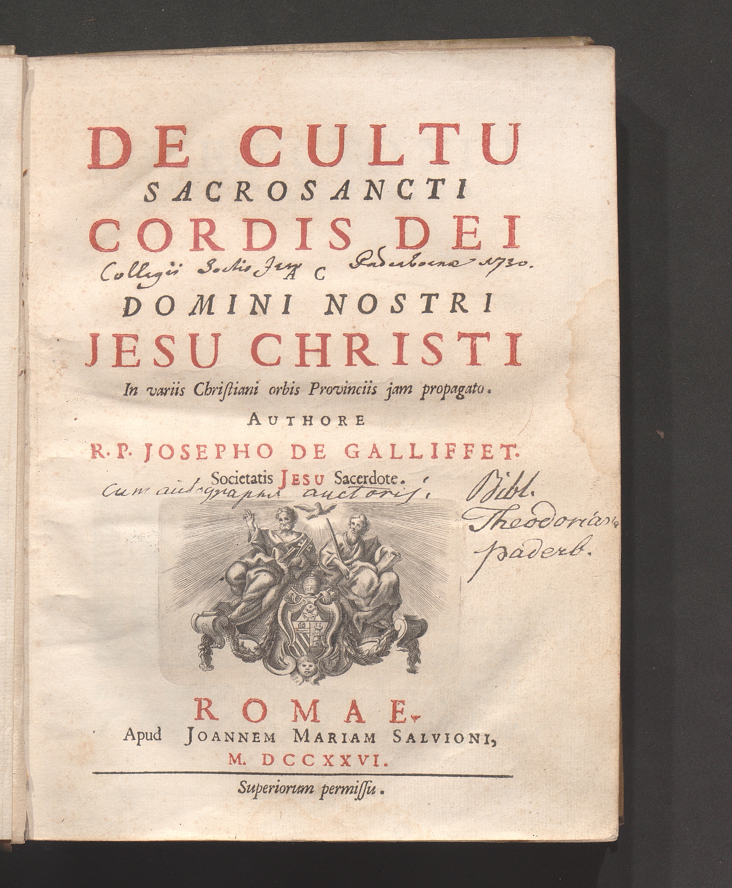 De Cultu Sacrosancti Cordis Dei Ac Domini Nostri Jesu Christi : In variis Christiani orbis Provinciis jam propagato / Authore R. P. Josepho De Galliffet. Societatis Jesu Sacerdote