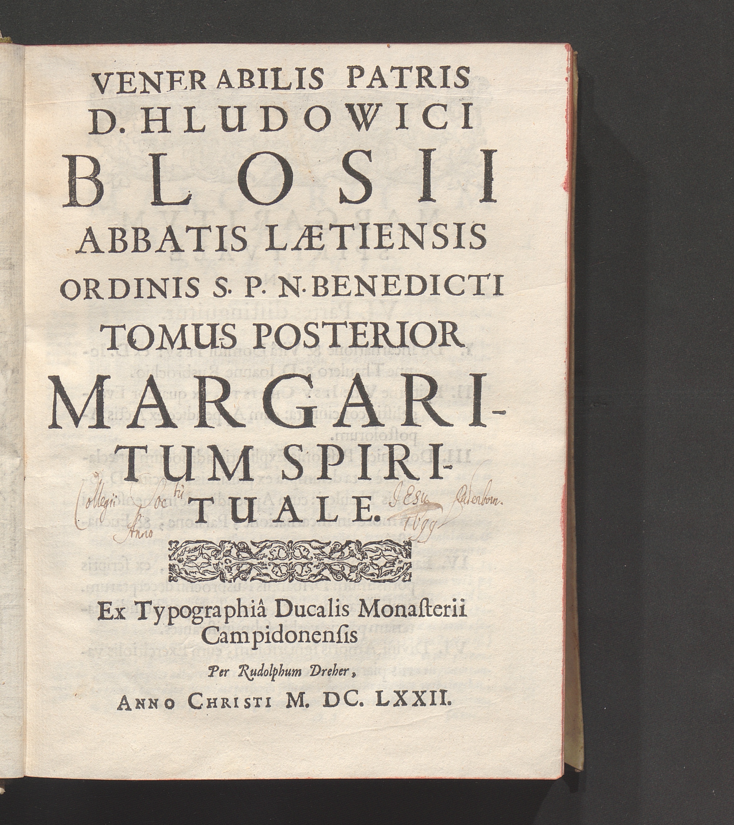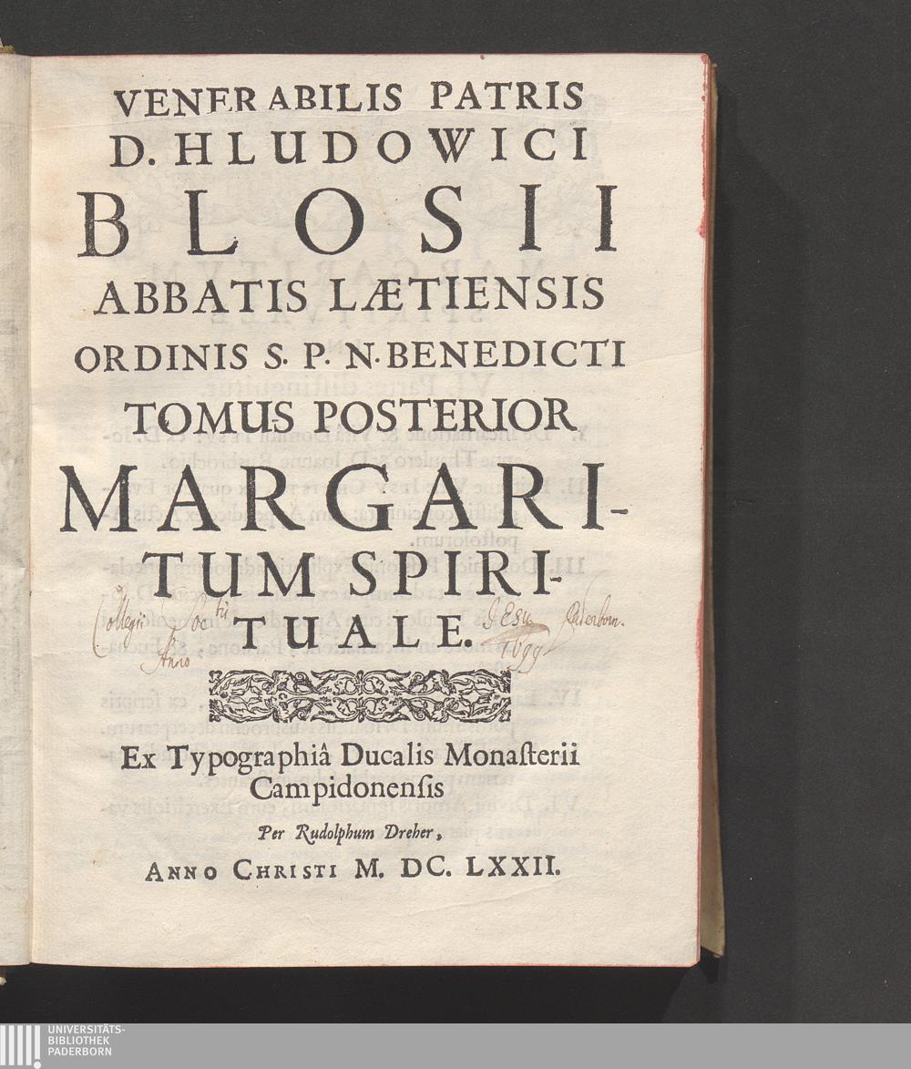 Venerabilis Patris D. Hludowici Blosii Abbatis Lætiensis Ordinis S. P. N. Benedicti Tomus Posterior Margaritum Spirituale