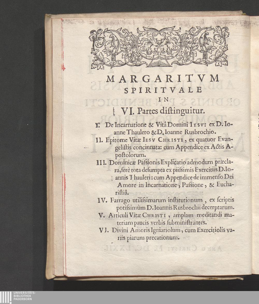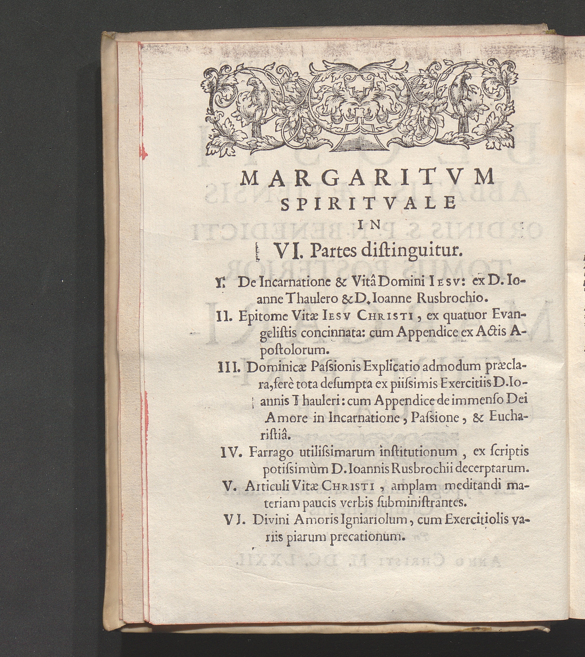 Sectio I. Margaritum Spirituale, Partibus sex distinctum.distinguitur.