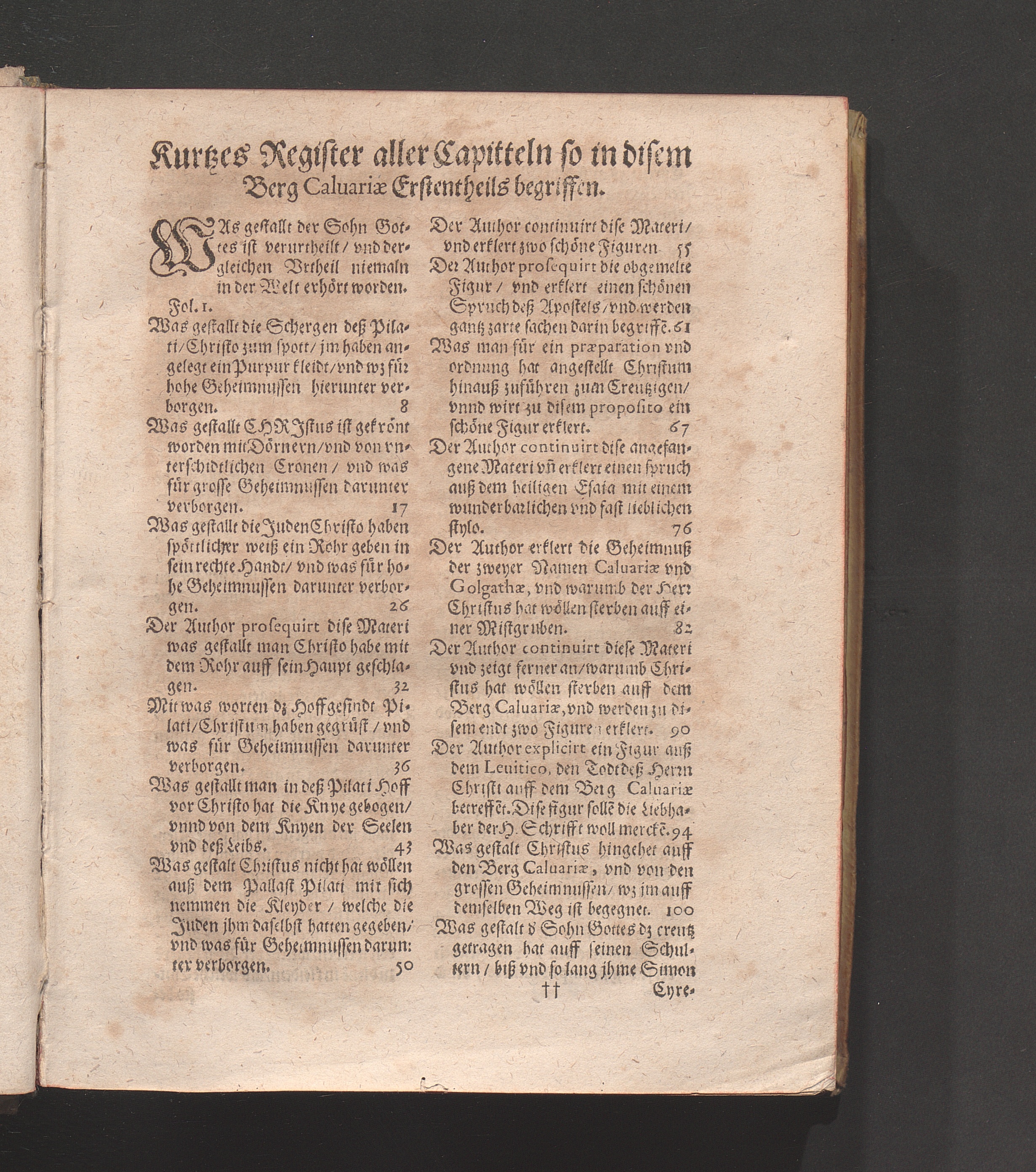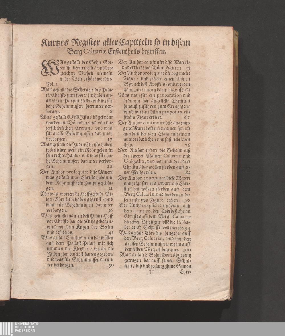 Kurtzes Register aller Capitteln so in disem Berg Caluariæ Erstentheils begriffe[...]