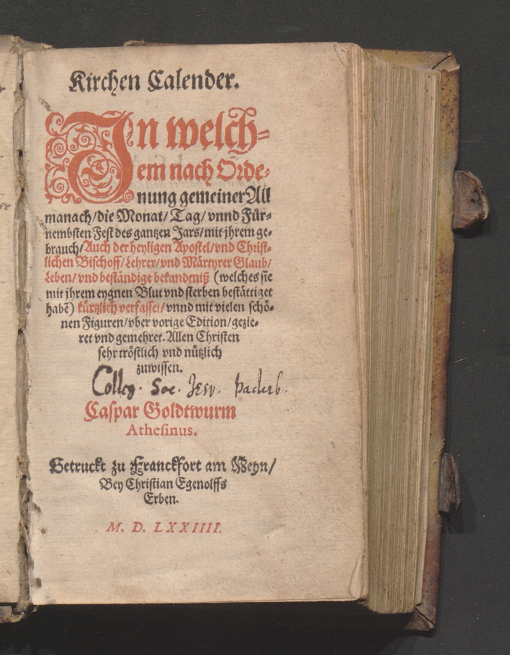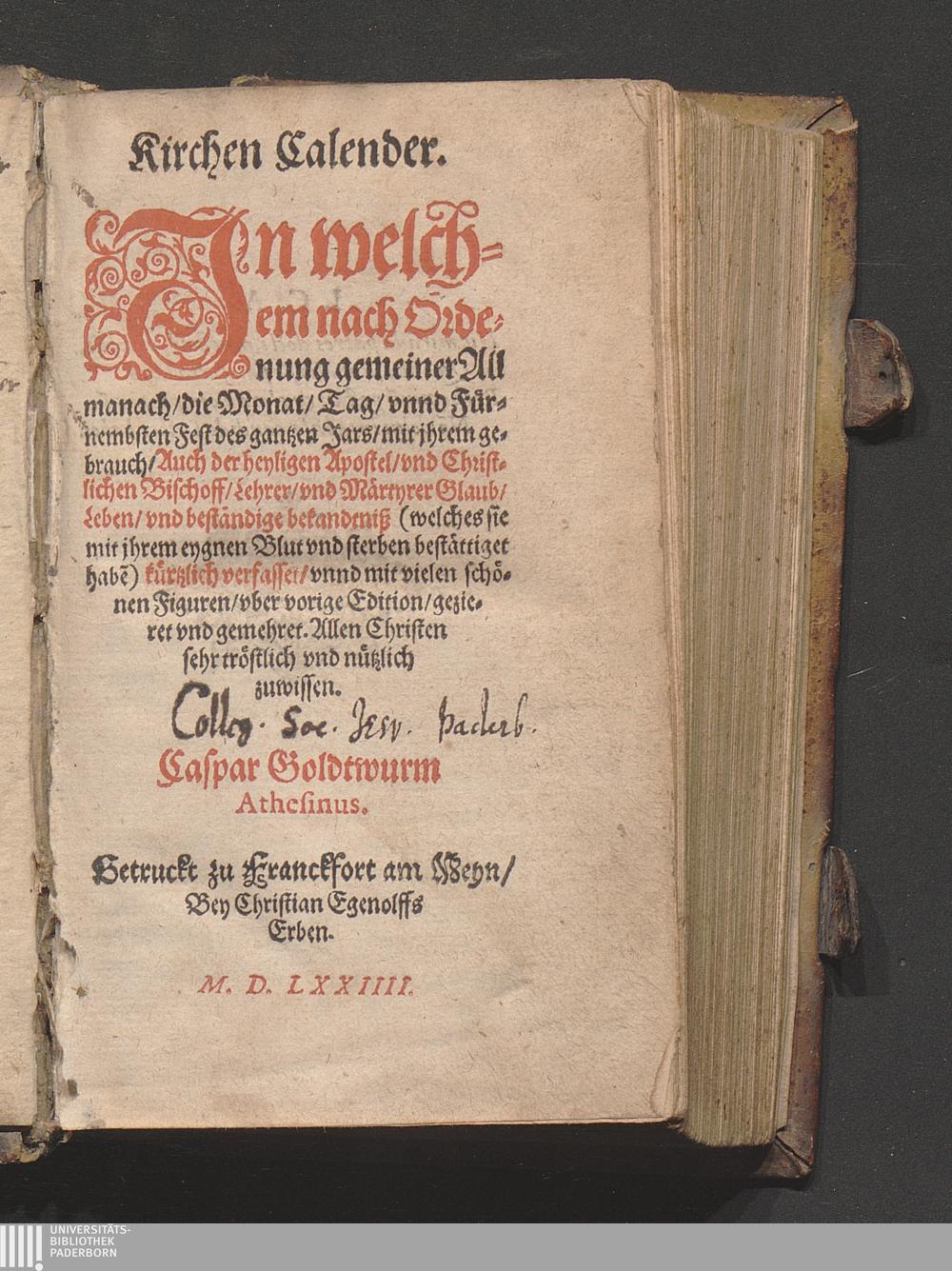 Kirchen Calender : Jn welchem nach Ordenung gemeiner Allmanach/ die Monat/ Tag/ vnnd Fürnembsten Fest des gantzen Jars/ mit jhrem gebrauch/ Auch der heyligen Apostel/ vnd Christlichen Bischoff/ Lehrer/ vnd Märtyrer Glaub/ Leben/ vnd beständige bekandtniß (welche sie mit jhrem eygnen Blut vnd sterben bestättiget habe[n]) / Caspar Goldtwurm Athesinus