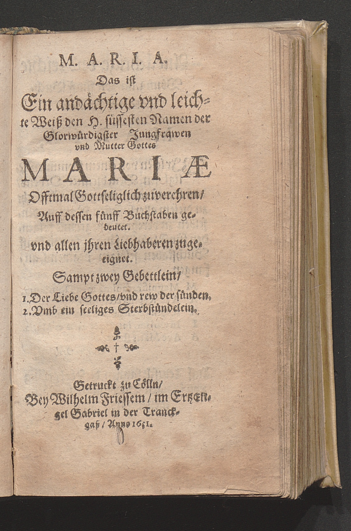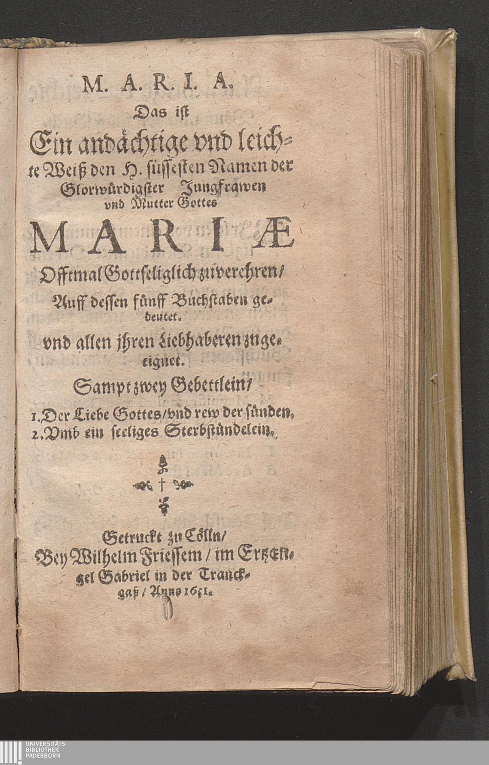 M. A. R. I. A. Das ist Ein andächtige vnd leichte Weiß den H. süssesten Namen der Glorwürdigster Jungfrawen vnd Mutter Gottes Mariæ Offtmal Gottseliglich zu verehren/ Auff dessen fünff Buchstaben gedeutet : Sampt zwey Gebettlein/ 1. Der Liebe Gottes/ vnd rew der sünden. 2. Vmb ein seeliges Sterbstündelein