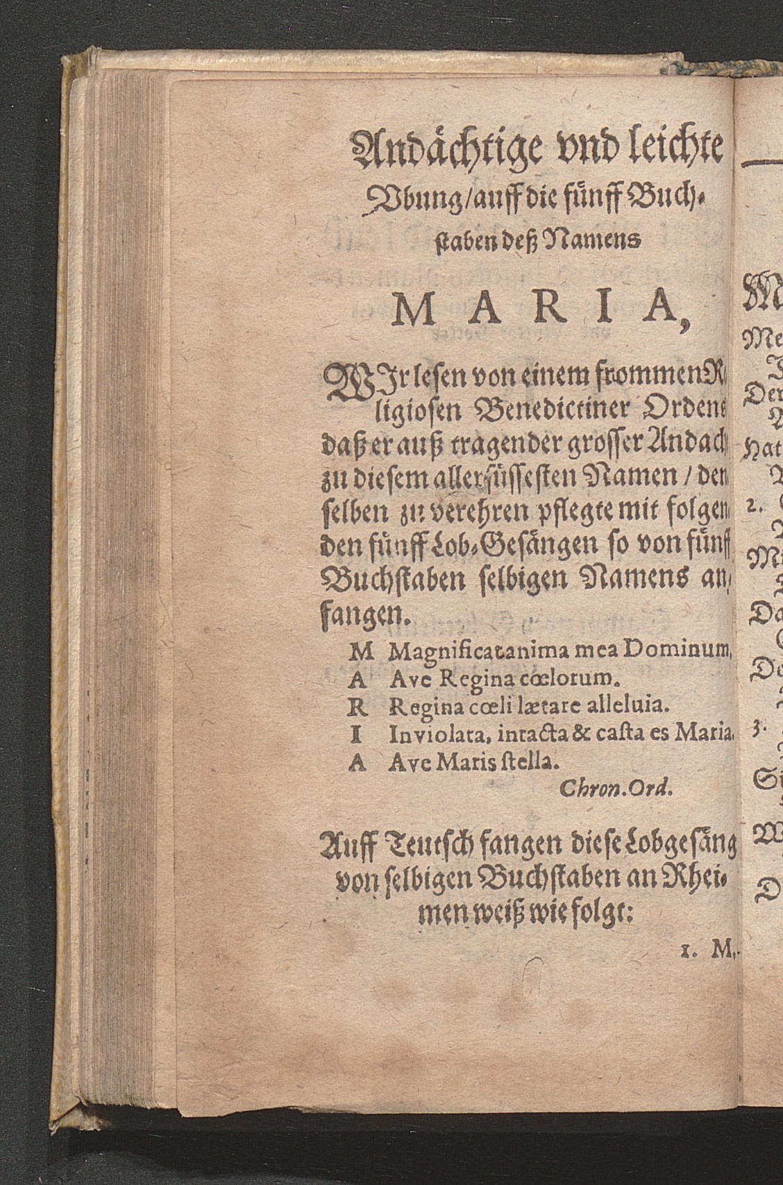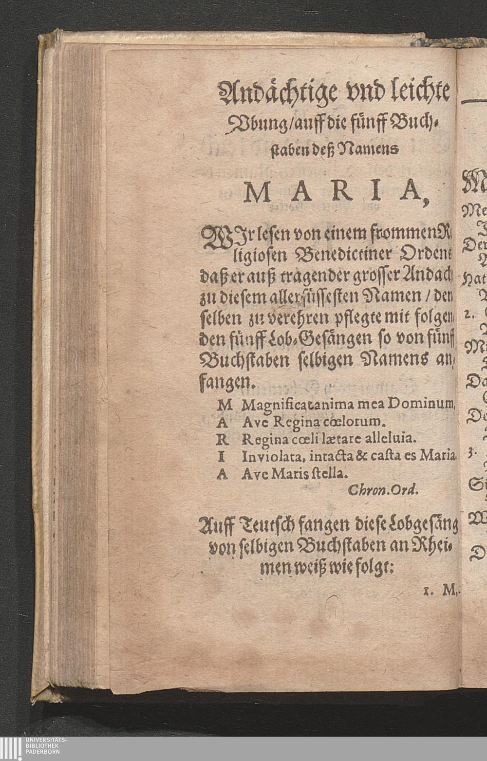 M. A. R. I. A. Das ist Ein andächtige vnd leichte Weiß den H. süssesten Namen der Glorwürdigster Jungfrawen vnd Mutter Gottes Mariæ Offtmal Gottseliglich zu verehren/ Auff dessen fünff Buchstaben gedeutet : Sampt zwey Gebettlein/ 1. Der Liebe Gottes/ vnd rew der sünden. 2. Vmb ein seeliges Sterbstündelein