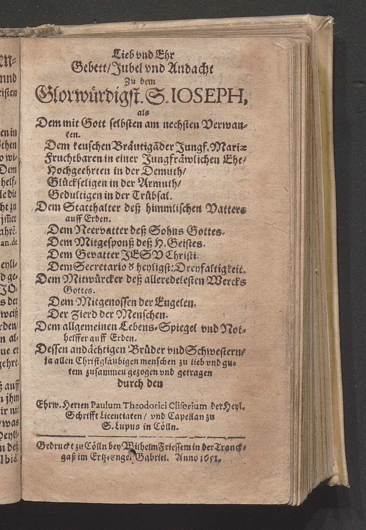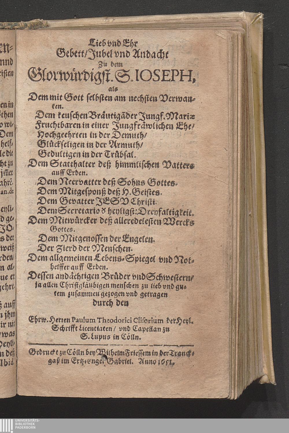 Lieb vnd Ehr Gebett/ Jubel vnd Andacht Zu dem Glorwürdigst. S. Ioseph, als Dem mit Gott selbsten am nechsten Verwanten : Dem keuschen Bräutiga[m] der Jungf. Mariæ ...