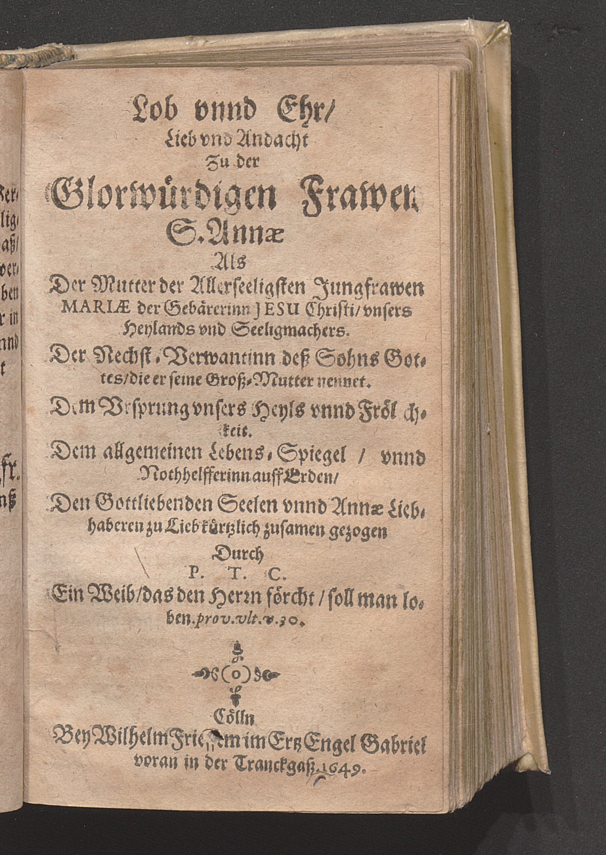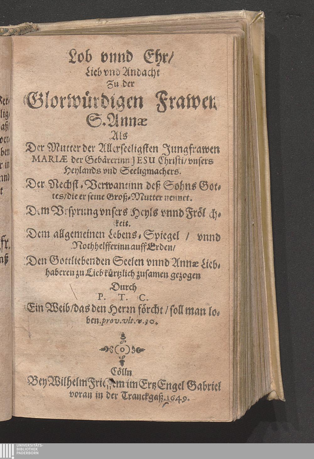 Lob vnnd Ehr/ Lieb vnd Andacht Zu der Glorwürdigen Frawen S. Annæ : Als Der Mutter der Allerseeligsten Jungfrawen Mariæ der Gebärerinn Jesu Christi/ vnsers Heylands vnd Seeligmachers ... / Durch P. T. C.