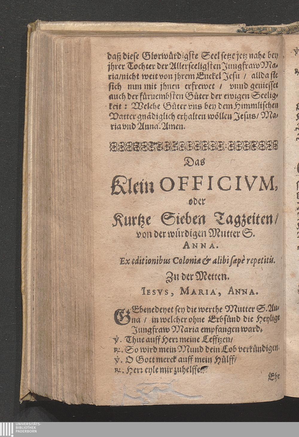 Das Klein Officivm, oder Kurtze Sieben Tagzeiten/ von der würdigen Mutter S. Ann[...]
