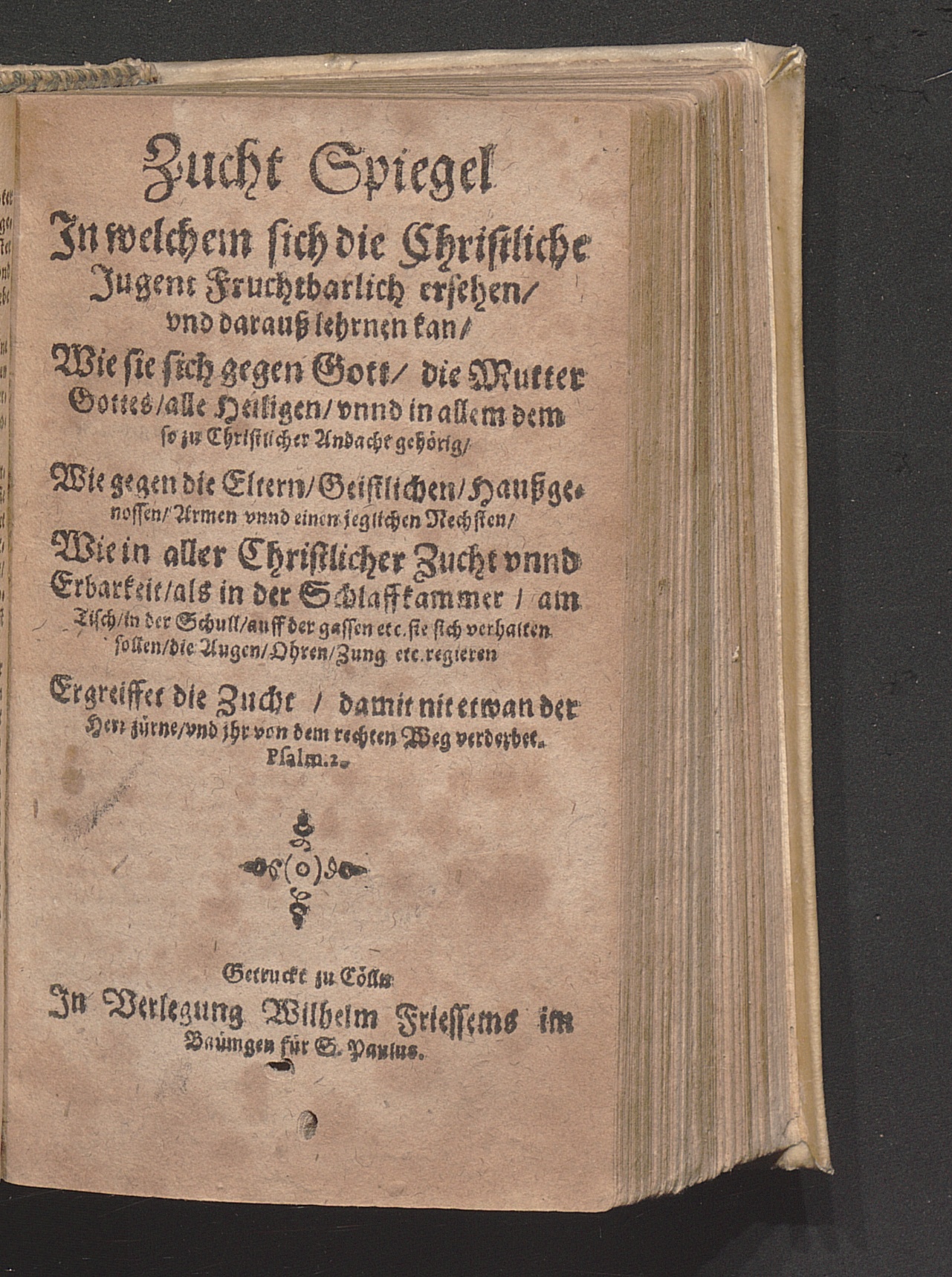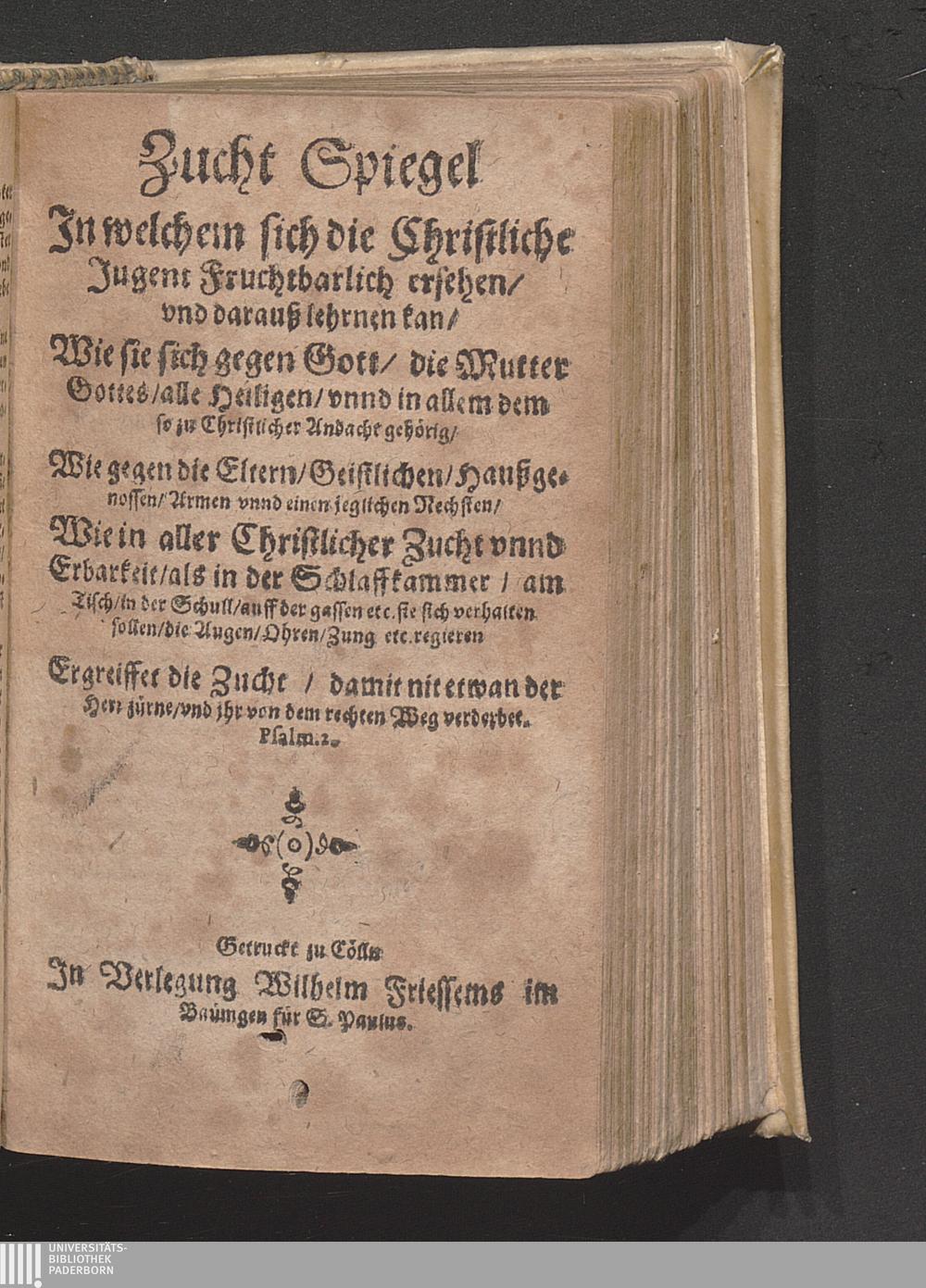 Zucht Spiegel : Jn welchem sich die Christliche Jugent Fruchtbarlich ersehen/ vnd darauß lehrnen kan/ Wie sie sich gegen Gott/ die Mutter Gottes ... verhalten sollen ...