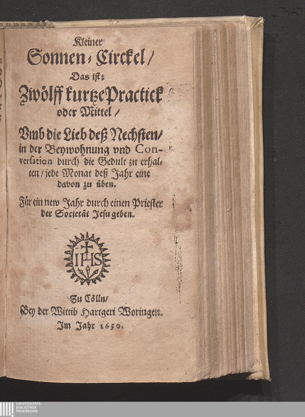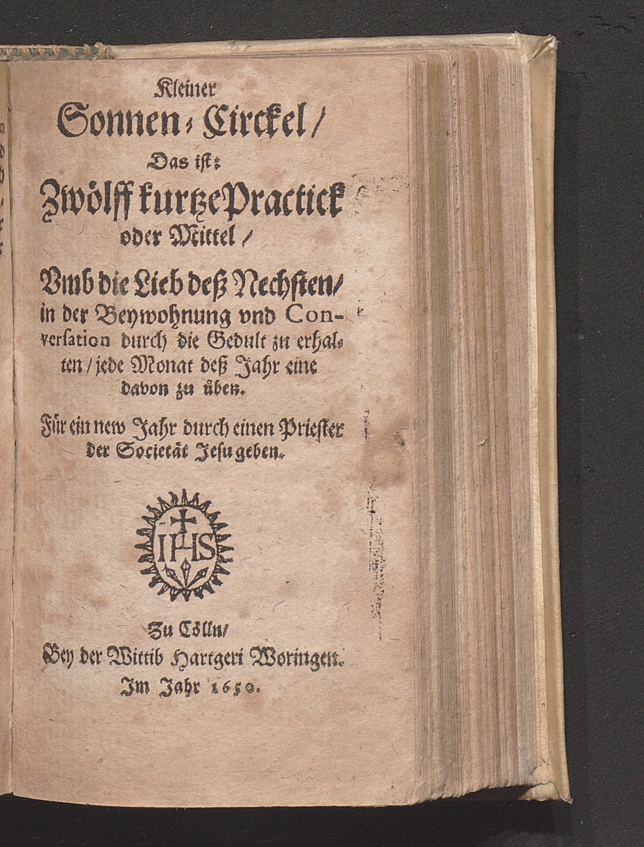 Kleiner Sonnen-Circkel/ Das ist: Zwölff kurtze Practick oder Mittel/ Vmb die Lieb deß Nechsten/ in der Beywohnung vnd Conversation durch die Gedult zu erhalten/ jede Monat deß Jahr eine davon zu üben / durch einen Priester der Societät Jesu geben