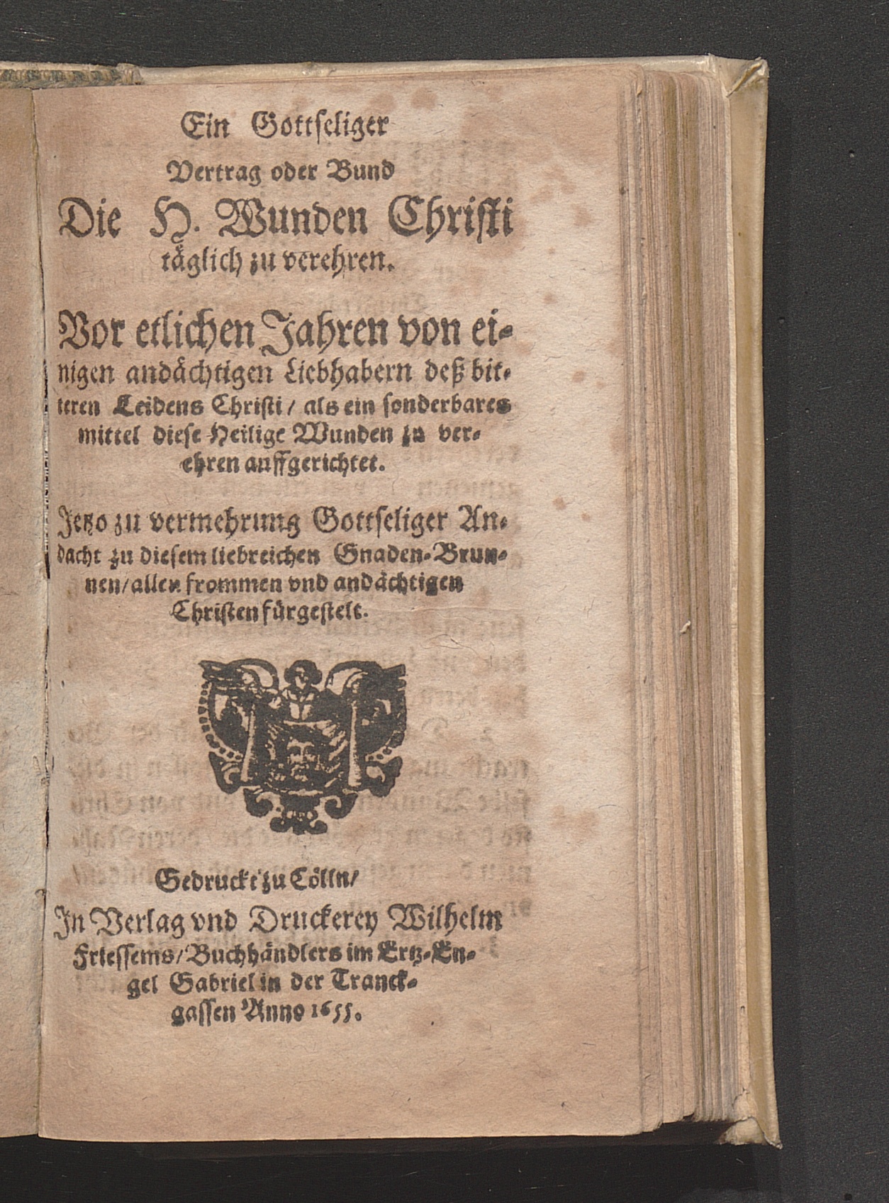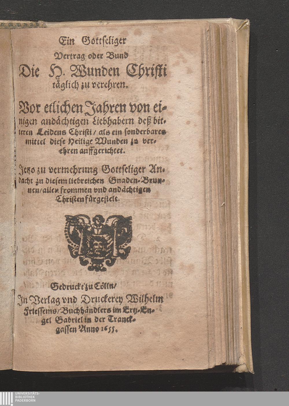 Ein Gottseliger Vertrag oder Bund Die H. Wunden Christi täglich zu verehren / Vor etlichen Jahren von einigen andächtigen Liebhabern deß bitteren Leidens Christi/ als ein sonderbares mittel diese Heilige Wunden zu verehren auffgerichtet