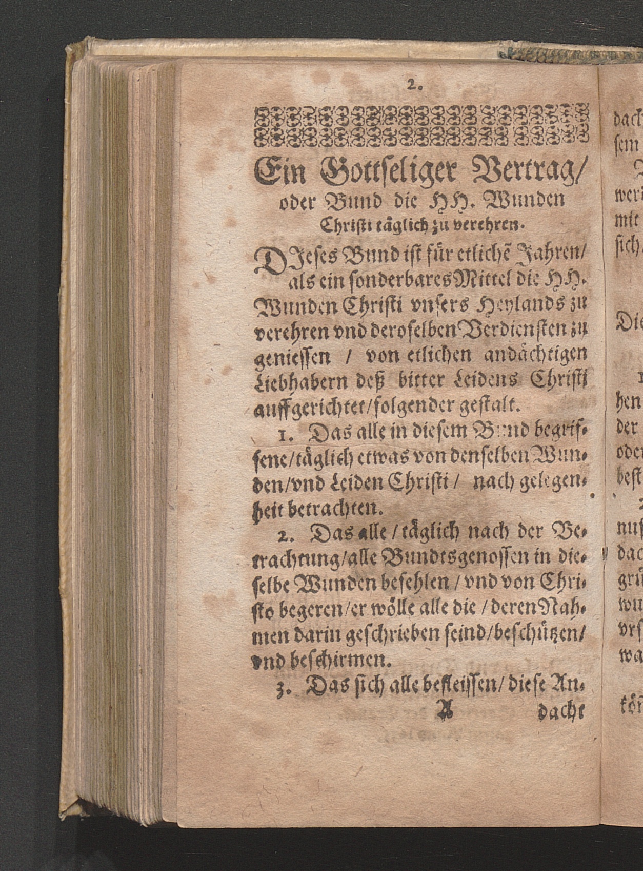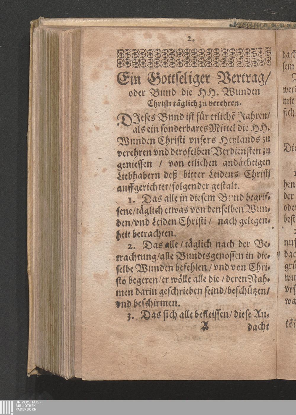 Ein Gottseliger Vertrag oder Bund Die H. Wunden Christi täglich zu verehren / Vor etlichen Jahren von einigen andächtigen Liebhabern deß bitteren Leidens Christi/ als ein sonderbares mittel diese Heilige Wunden zu verehren auffgerichtet