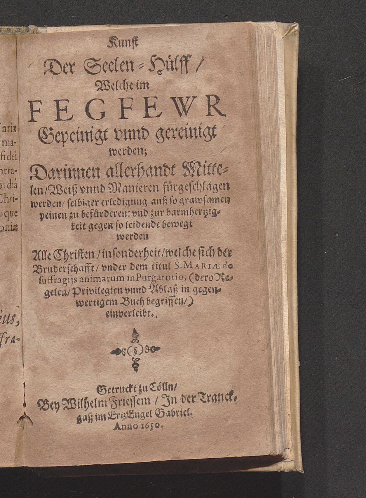 Kunst Der Seelen-Hülff/ Welche im Fegfewr Gepeinigt vnnd gereinigt werden : Darinnen allerhandt Mittelen/ Weiß vnnd Manieren fürgeschlagen werden/ selbiger erledigung auß so grawsamen peinen zu befürderen: vnd zur barmhertzigkeit gegen so leidende bewegt werden