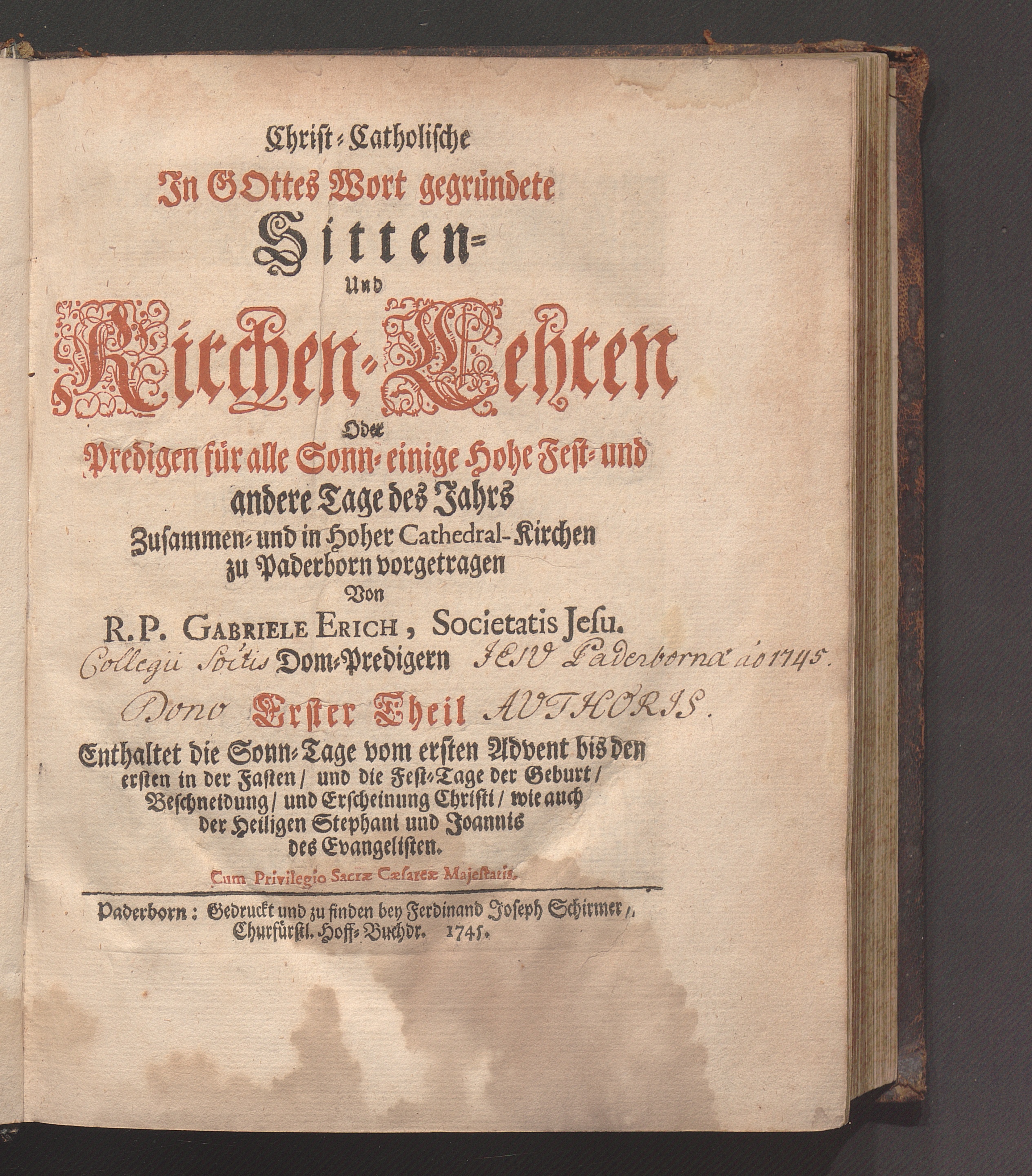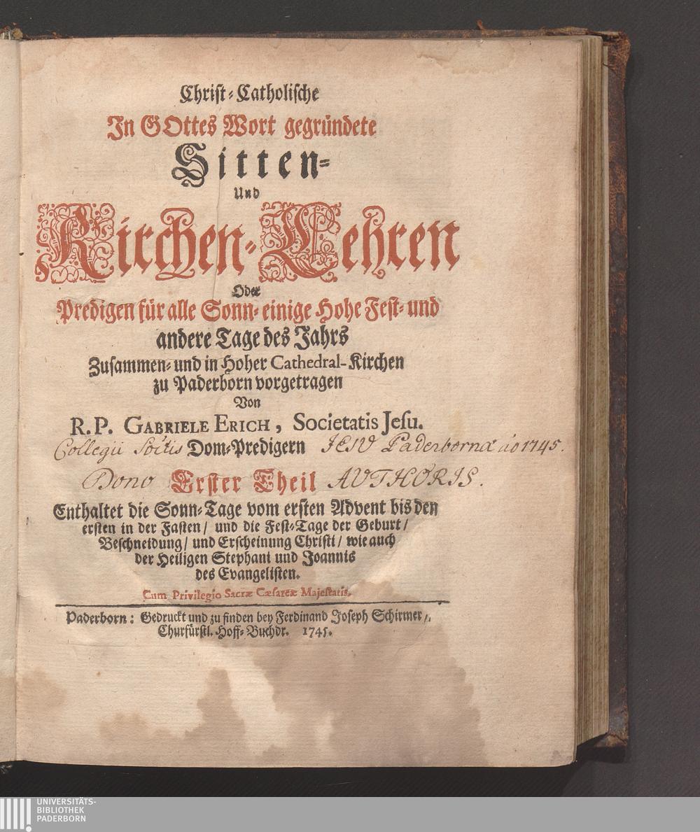 Erster Theil (1745) Enthaltet die Sonn-Tage vom ersten Advent bis den ersten in der Fasten/ und die Fest-Tage der Geburt/ Beschneidung/ und Erscheinung Christi/ wie auch der Heiligen Stephani und Joannis des Evangelisten