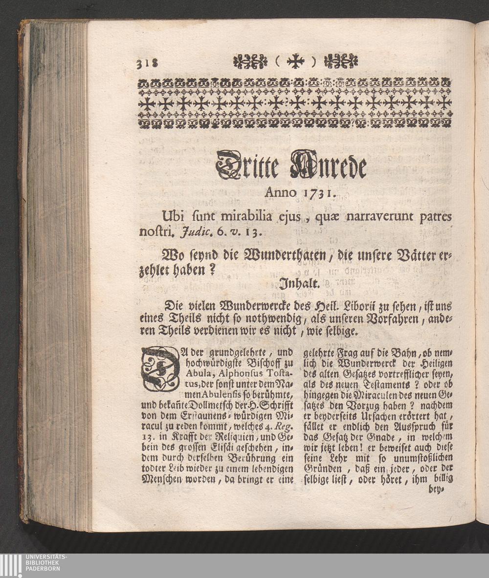 Vierter Theil (1751) Enthaltet erstlich, Jene Feyertäge, so in den drey vorgehenden Bücheren ausgelassen. Zweytens, Einige zu Ehren des Heil. Liborii gesagte Anreden. Und drittens Bey verschiedenen Gelegenheiten vorgebrachte Lob- und Ehren-Reden