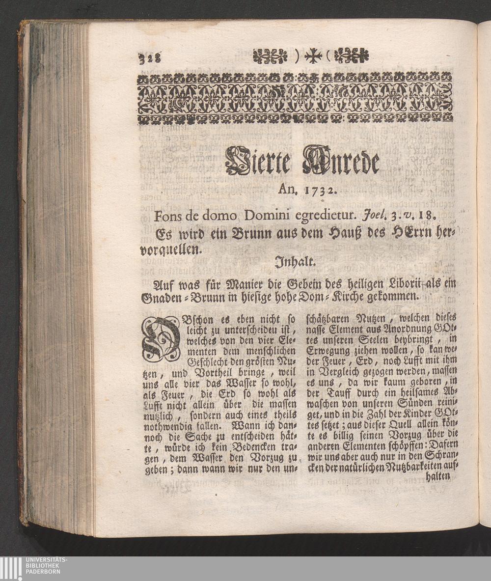 Vierter Theil (1751) Enthaltet erstlich, Jene Feyertäge, so in den drey vorgehenden Bücheren ausgelassen. Zweytens, Einige zu Ehren des Heil. Liborii gesagte Anreden. Und drittens Bey verschiedenen Gelegenheiten vorgebrachte Lob- und Ehren-Reden