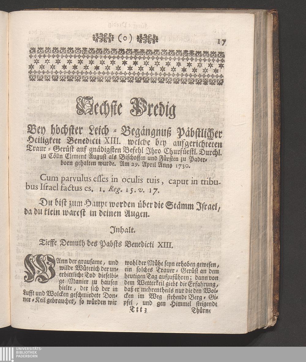 Vierter Theil (1751) Enthaltet erstlich, Jene Feyertäge, so in den drey vorgehenden Bücheren ausgelassen. Zweytens, Einige zu Ehren des Heil. Liborii gesagte Anreden. Und drittens Bey verschiedenen Gelegenheiten vorgebrachte Lob- und Ehren-Reden