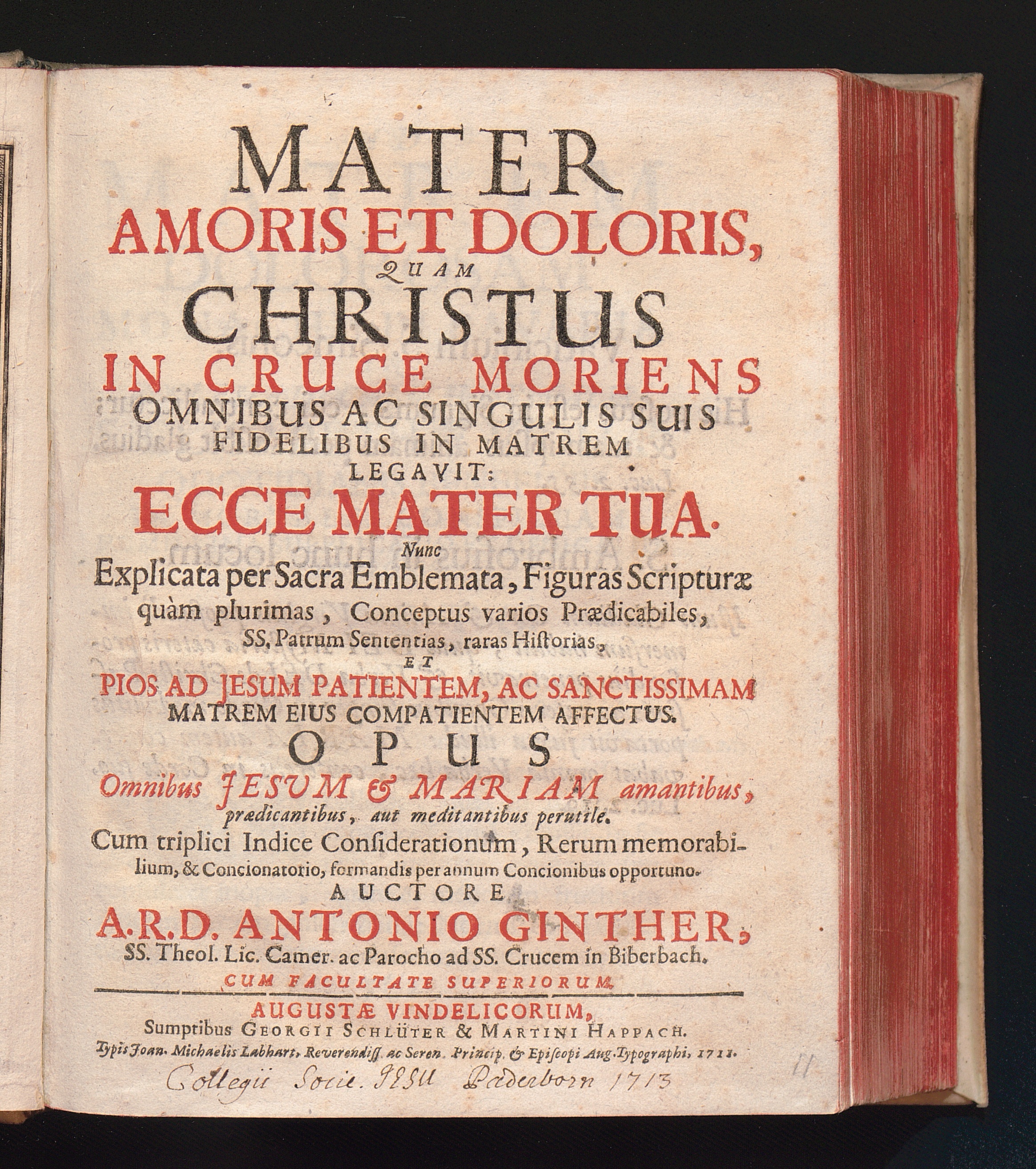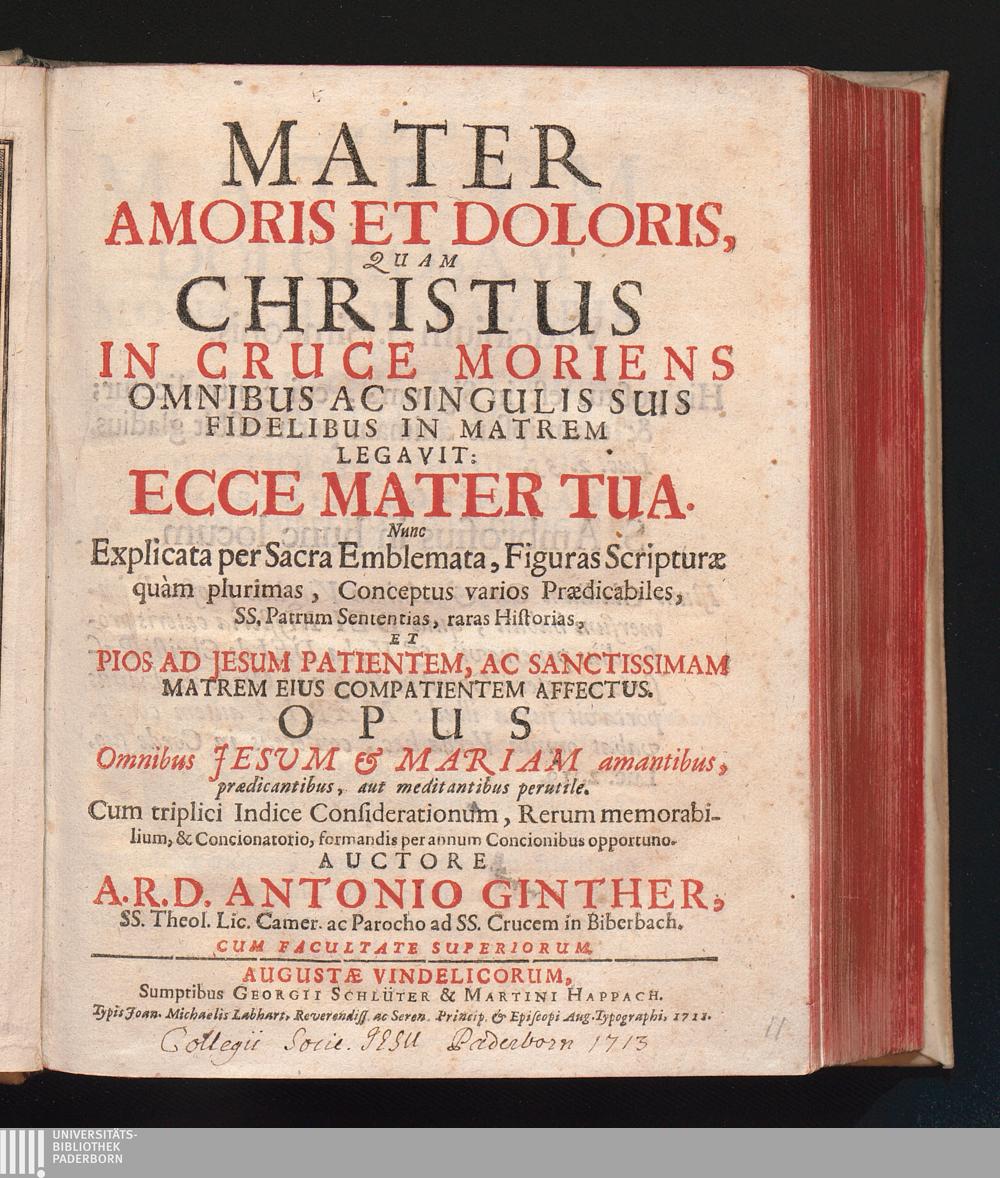 Mater Amoris Et Doloris : Quam Christus In Cruce Moriens Omnibus Ac Singulis Suis Fidelibus In Matrem Legavit: Ecce Mater Tua. Nunc Explicata per Sacra Emblemata ... / Auctore A. R. D. Antonio Ginther, SS. Theol. Lic. Camer. ac Parocho ad SS. Crucem in Biberbach