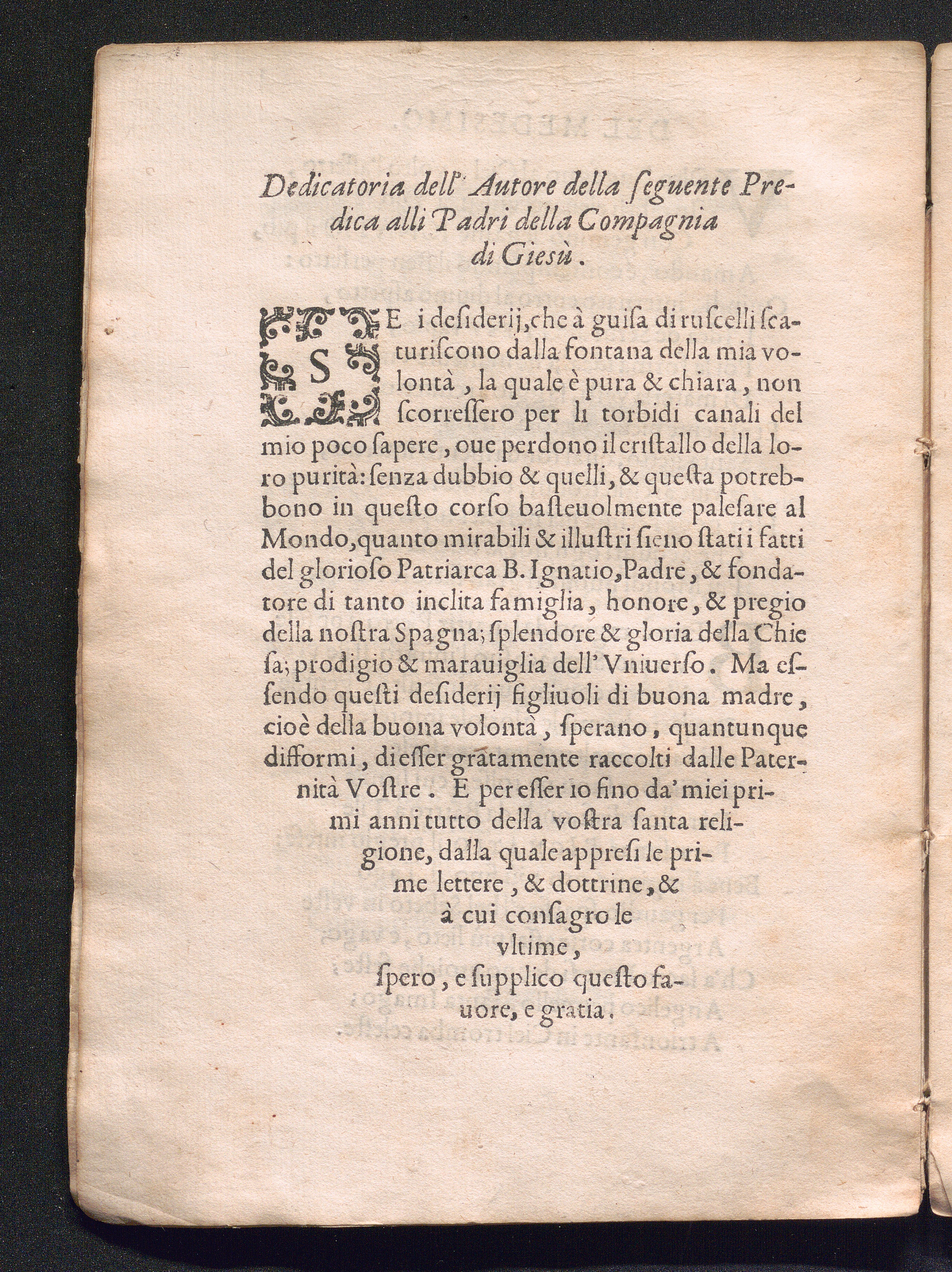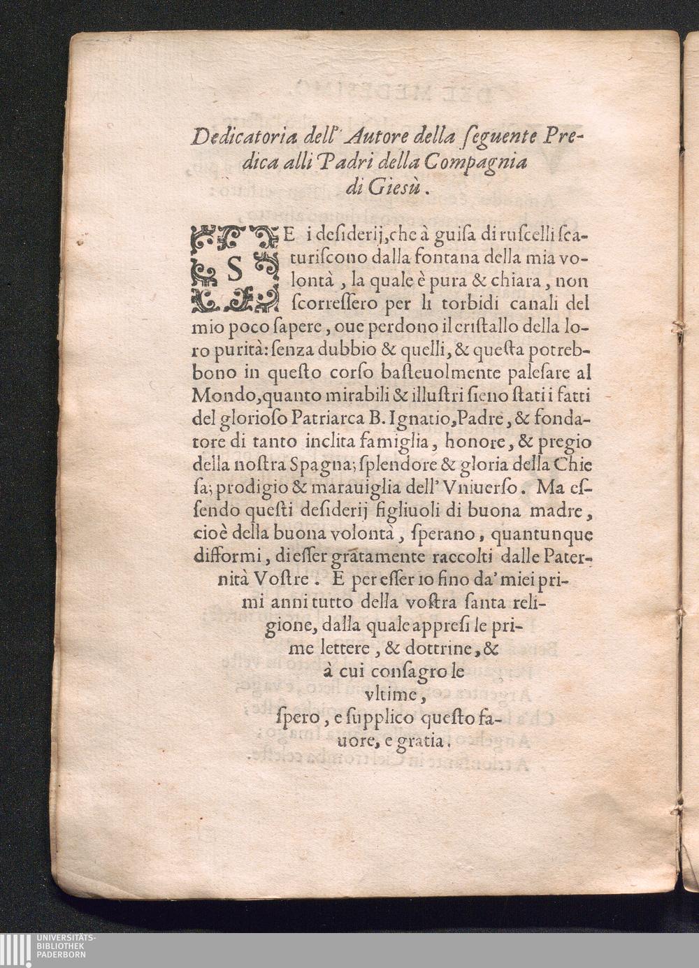 Dedicatoria dell' Autore della seguente Predica alli Padri della Compagnia die Giesù.