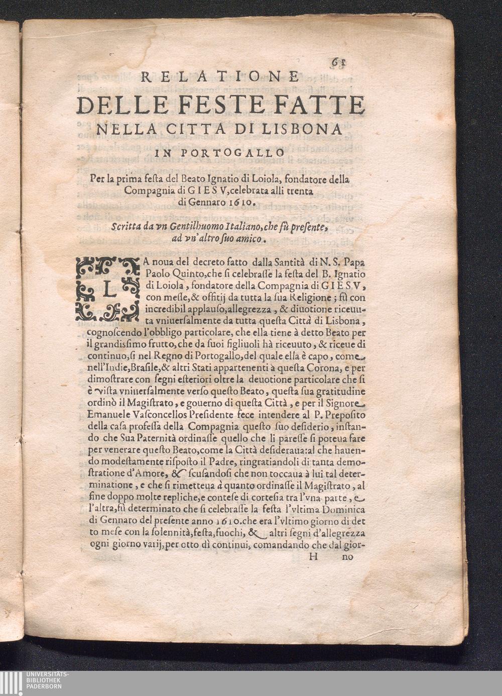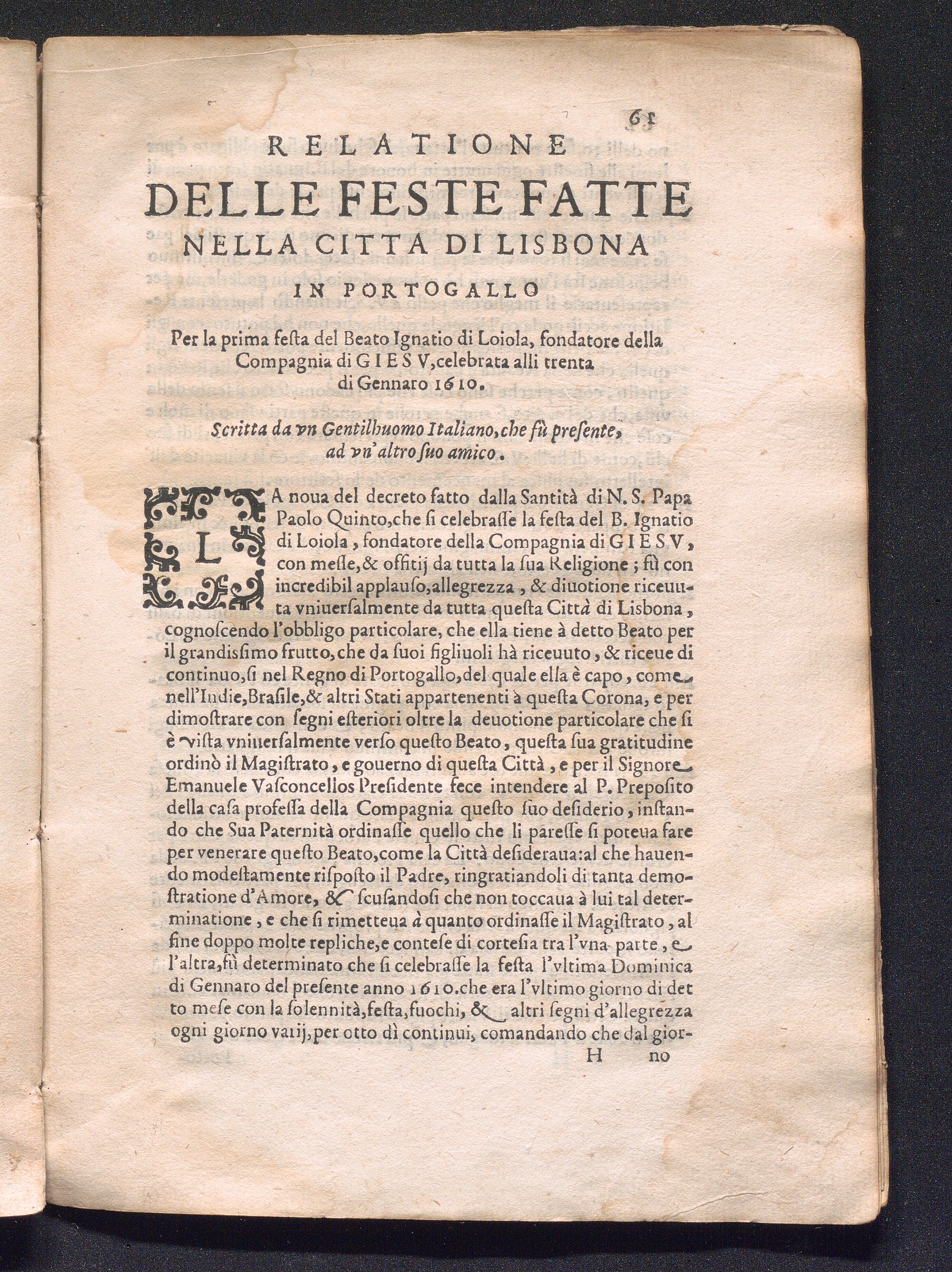 Relatione Delle Feste Fatte Nella Citta Di Lisbona In Portogallo Per prima festa del Beato Ignatio di Loiola, fondatore della Compagnia di Giesv, celebrata alli trenta di Gennaro 1610. Scritta da vn Gentilhuomo Italiano, che fù presente, ad vn'altro suo amico.
