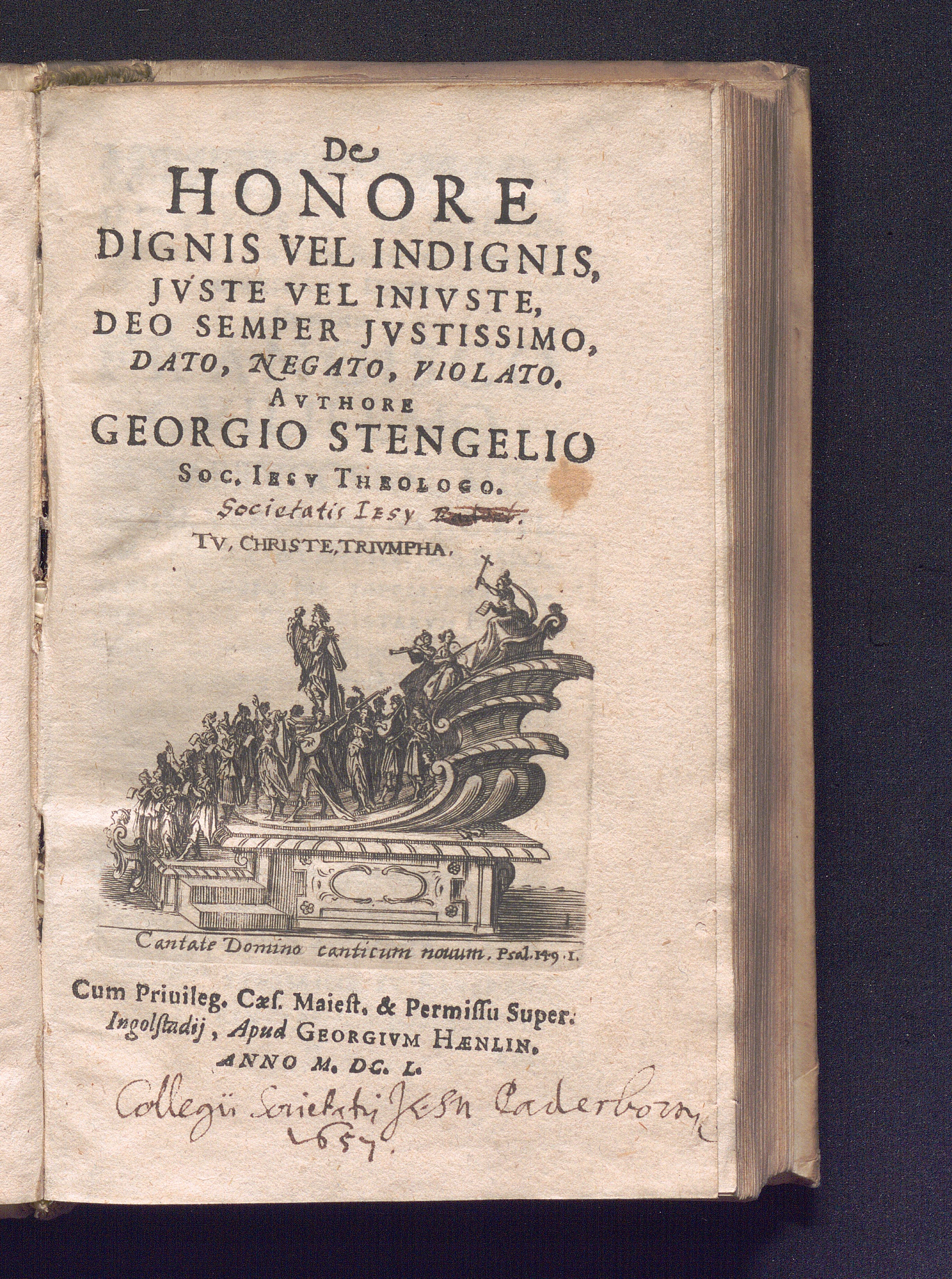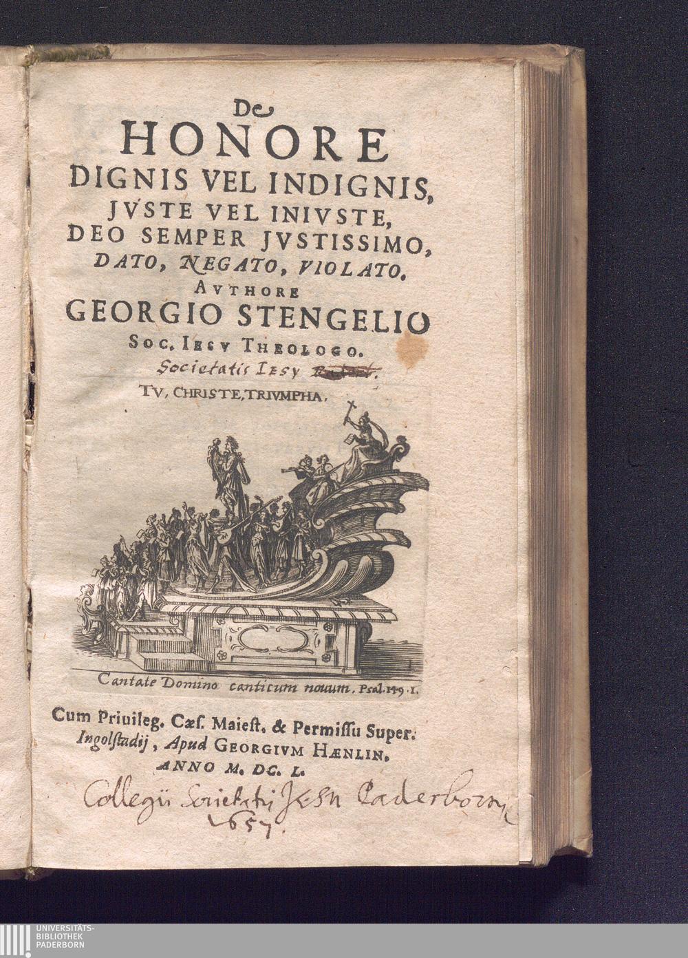 De Honore, Dignis Vel Indignis, Jvste Vel Inivste, Deo Semper Jvstissimo, Dato, Negato, Violato / Authore Georgio Stengelio Soc. Iesv Thelogo