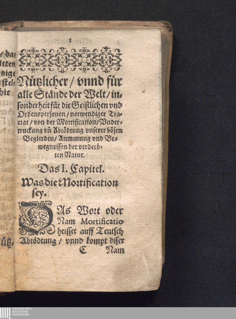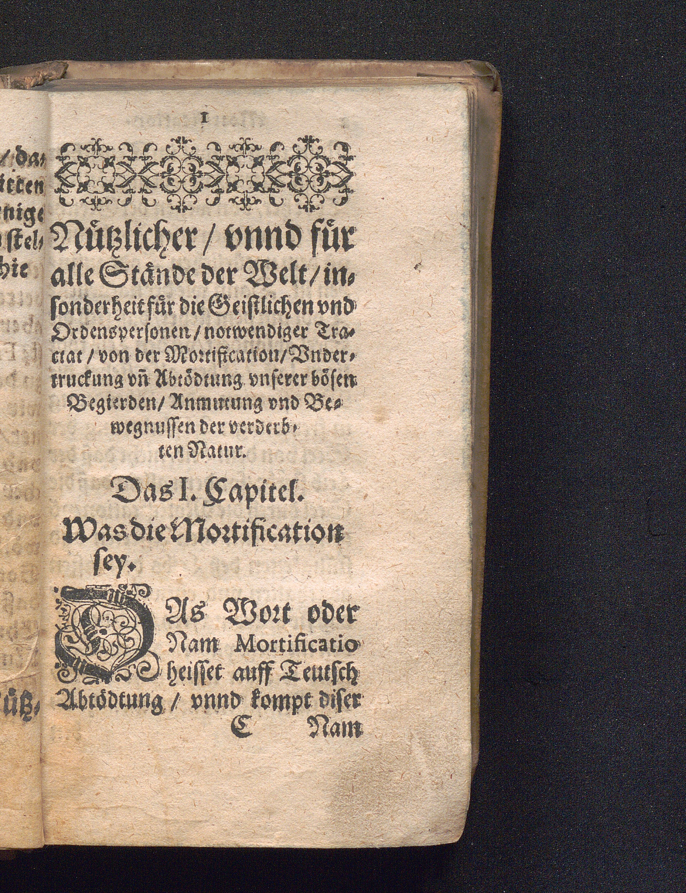 Mortificationbüchlein/|| Das ist:|| Ernstlicher/ aber nutzli=||cher/ vnd für alle Ständt der|| Welt/ insonders für die Geistlichen vnd || Ordenspersonen/ notwendiger Tractat/ von || der Mortification/ Vndertruckung/ vnnd || Abtödtung vnserer bösen Begierden/|| Anmuthung vnd Bewögnussen || der verkehrten Natur / Erstlich durch R. P. Iulium Fatium, der Societet Iesv/ inn Welscher Sprach beschriben: Darnach inn die Lateinische/ Jetzo in die Teutsche Sprach verdolmetscht: Durch Den Ehrwirdigen Herren Martinum Huber/ der H. Schrifft Baccalaureum, deß löbliche[n] Stiffts bey S. Mauritze[n] in Augspurg Canonicum vnd Custodem