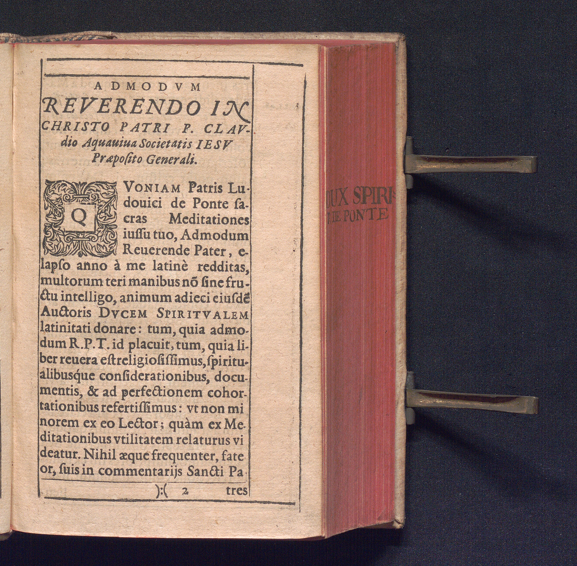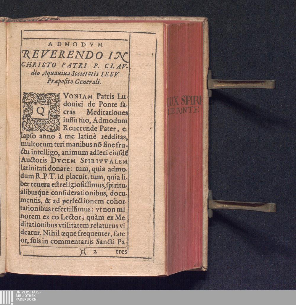 Dvx Spiritvalis : In Qvo Agitvr De Oratione, Meditatione, & Contemplatione: De Visitationibus Divinis, Gratijsque extraordinarijs: De Mortificatione, Heroicisque actionibus, sive operibus, quæ illas omnes comitantur / Avctore R. P. Lvdovico De Ponte Vallis-Oletano, Societatis Iesv. Interprete R.P. Melchiore Trevinnio eiusdem Societatis Iesv Presbytero