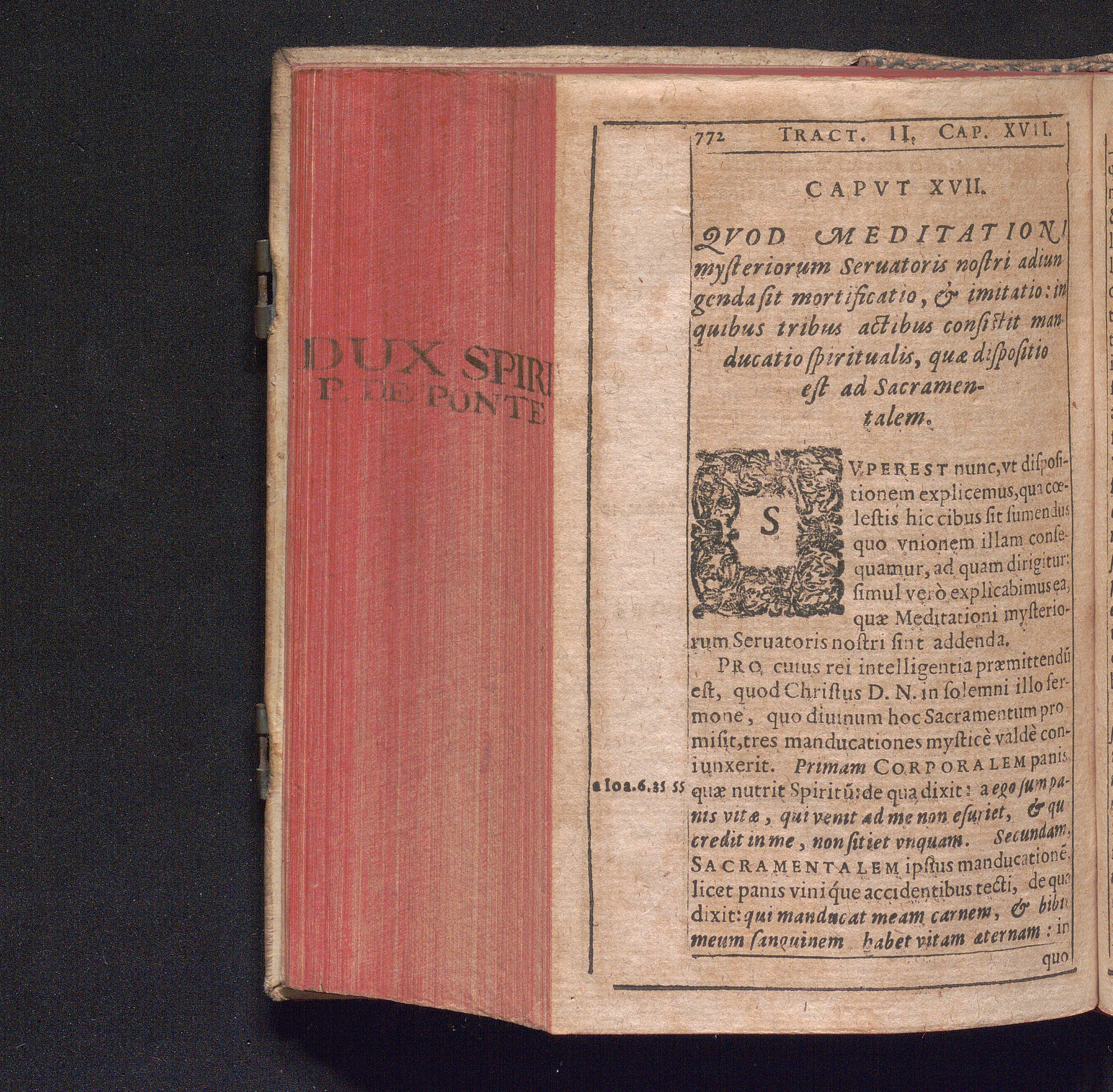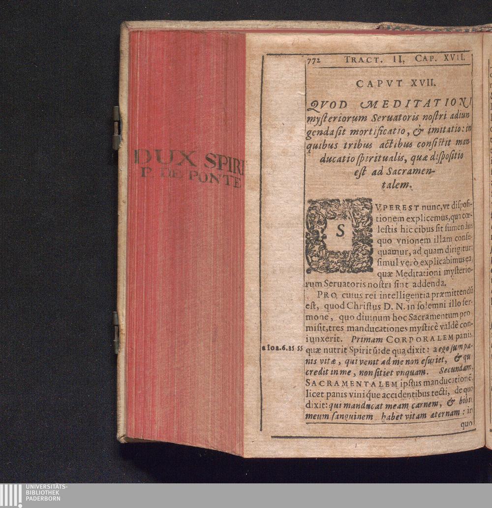 Dvx Spiritvalis : In Qvo Agitvr De Oratione, Meditatione, & Contemplatione: De Visitationibus Divinis, Gratijsque extraordinarijs: De Mortificatione, Heroicisque actionibus, sive operibus, quæ illas omnes comitantur / Avctore R. P. Lvdovico De Ponte Vallis-Oletano, Societatis Iesv. Interprete R.P. Melchiore Trevinnio eiusdem Societatis Iesv Presbytero