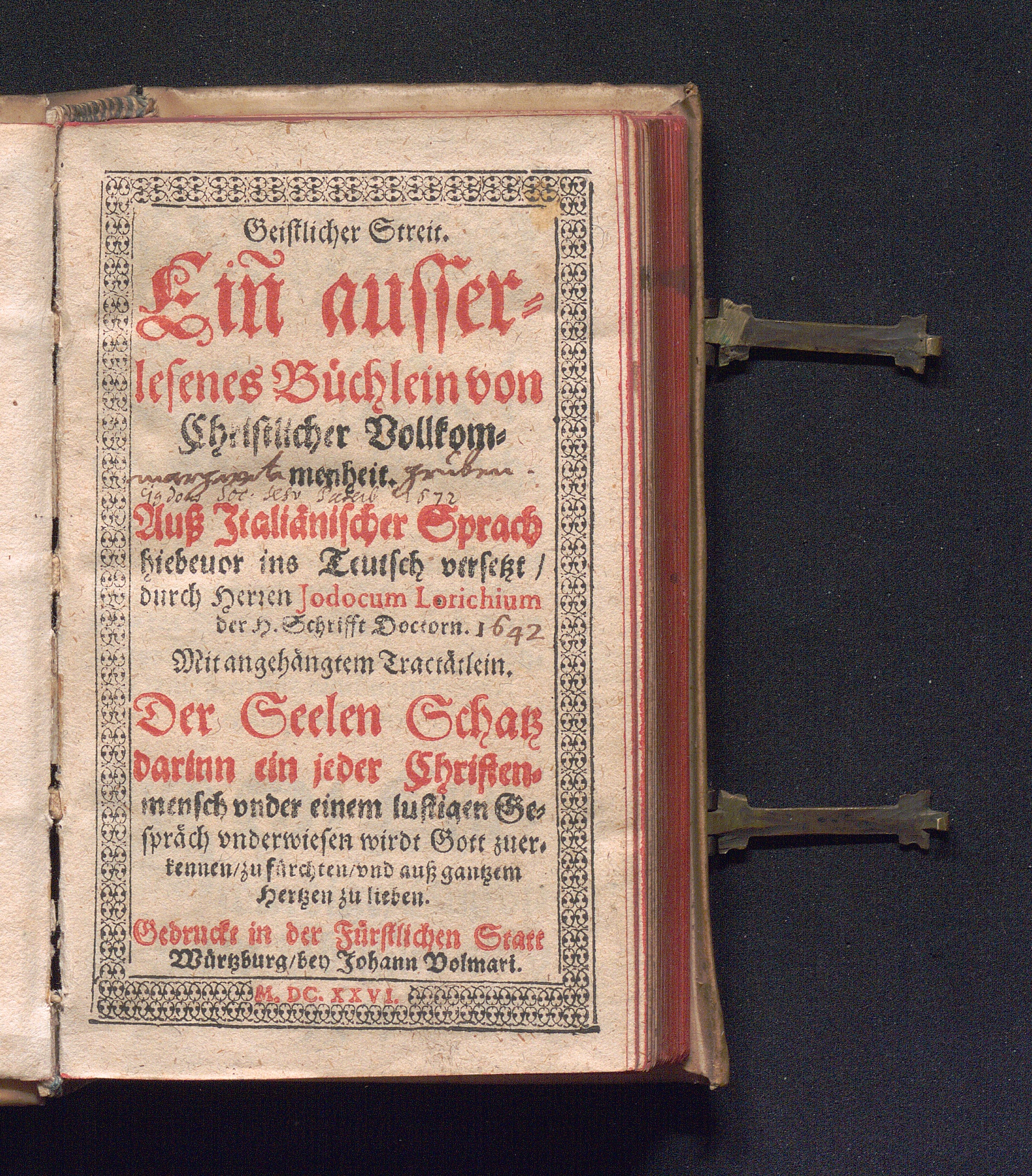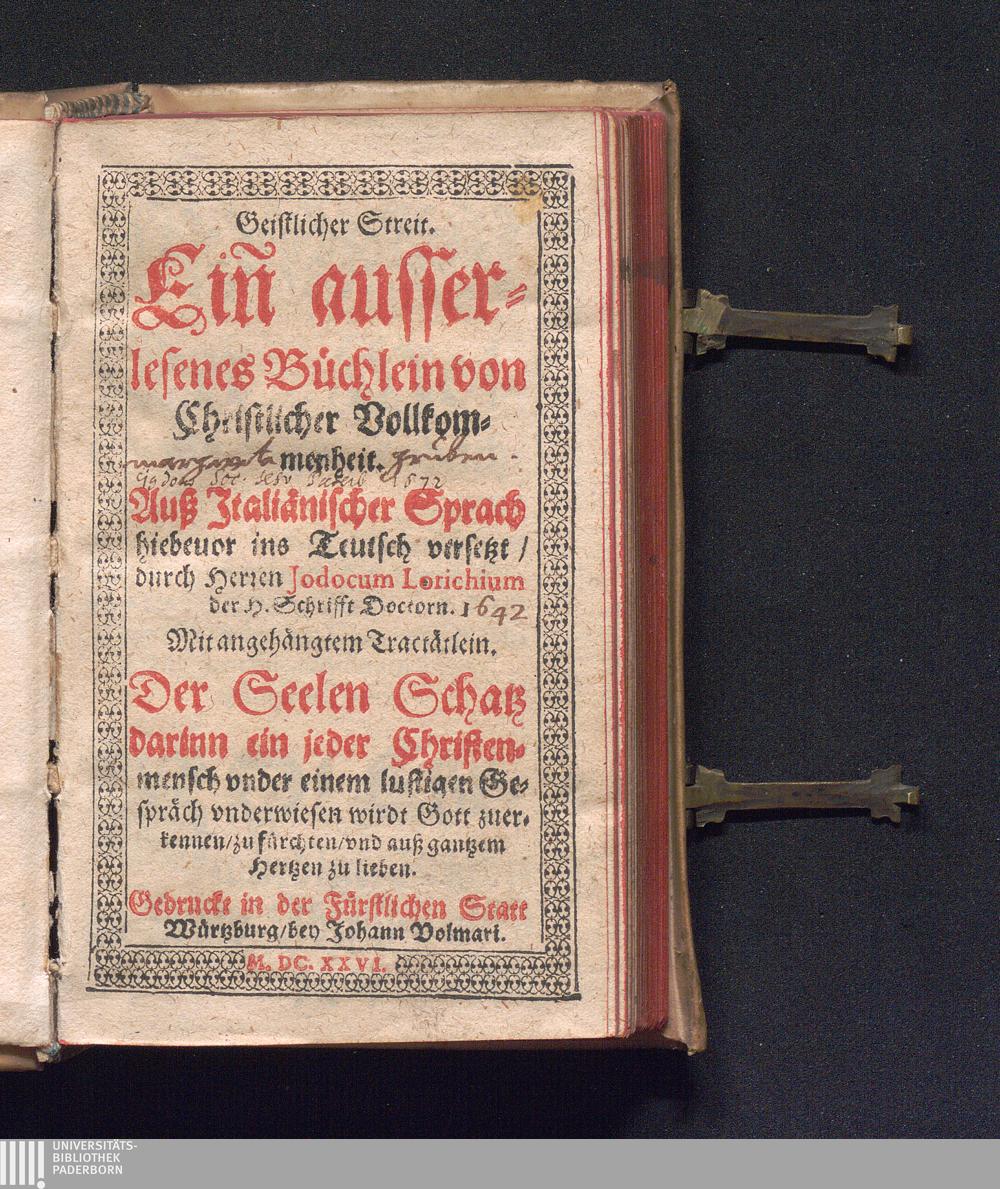 Geistlicher Streit : Ein ausserlesenes Büchlein von Christlicher Vollkommenheit : Mit angehängtem Tractätlein. Der Seelen Schatz darinn ein jeder Christenmensch vnder einem lustigen Gespräch vnderwiesen wirdt Gott zuerkennen/ zu fürchten/ vnd auß gantzem Hertzen zu lieben / [Lorenzo Scupoli]. Auß Jtaliänischer Sprach hiebeuor ins Teutsch versetzt/ durch Herren Jodocum Lorichium der H. Schrifft Doctorn