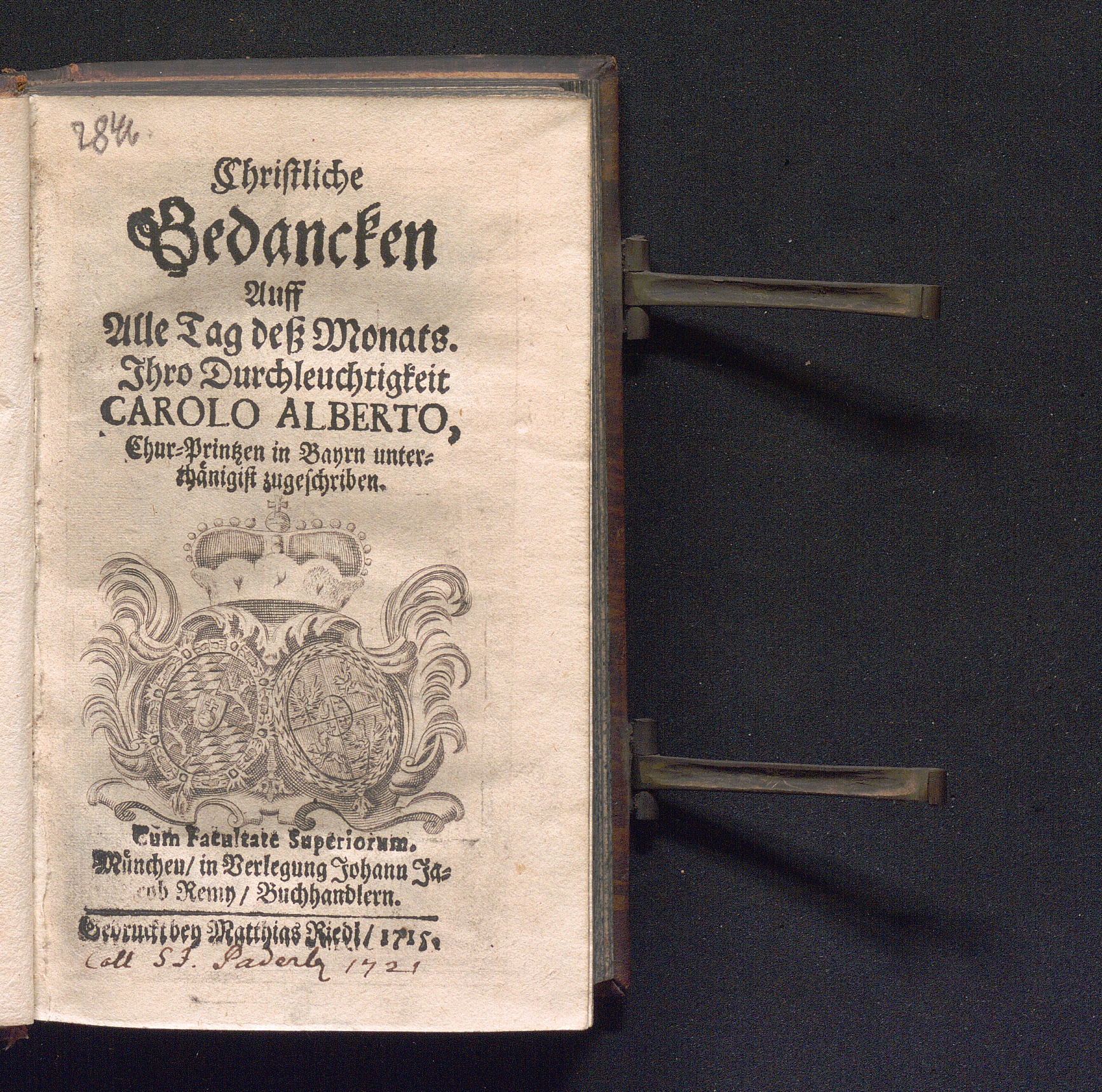Christliche Gedancken Auff Alle Tag deß Monats. Ihro Durchleuchtigkeit Carolo Alberto, Chur-Printzen in Bayrn, unterthänigist zugeschriben