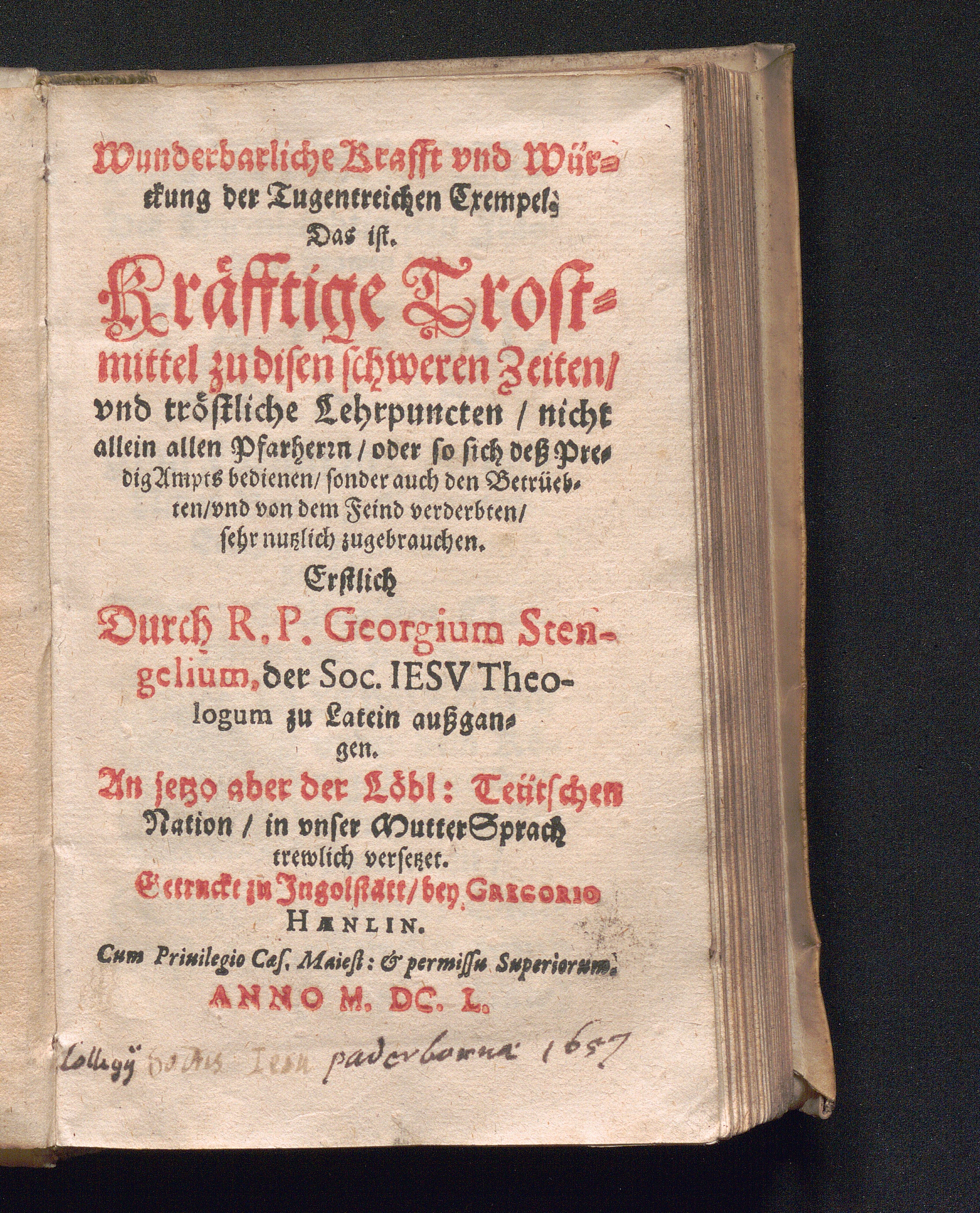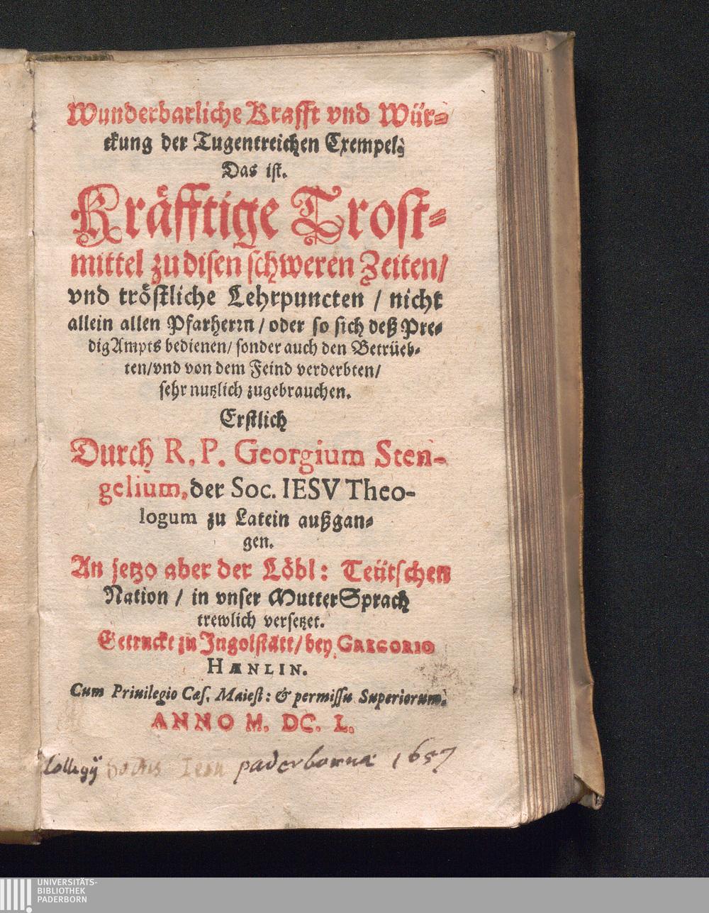 Wunderbarliche Krafft vnd Würckung der Tugentreichen Exempel. Das ist. Kräfftige Trostmittel zu disen schweren Zeiten/ vnd tröstliche Lehrpuncten/ nicht allein allen Pfarherrn/ oder so sich deß PredigAmpts bedienen/ sonder auch den Betrüebten/ vnd von dem Feind verderbten/ sehr nutzlich zugrbrauchen / Erstlich durch R. P. Georgium Stengelium, der Soc. Iesv Theologum zu Latein aussgangen. An jetzo aber der Löbl. Teütschen Nation/ in unser MutterSprach trewlich versetzet