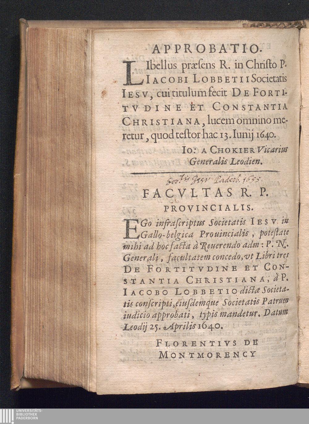 Jacobi Lobbetii Leodiensis E Societate Iesv, De Fortitvdine Et Constantia Christiana Libri Tres : Ad Reverendvm Admodvm In Christo Patrem Mvtivm Vitellescvm Societatis Jesv Præpositum Generalem; ipso conditæ Societatis Anno Sæcvlari