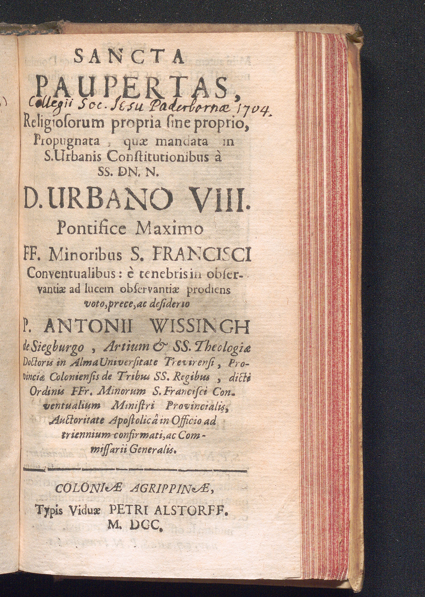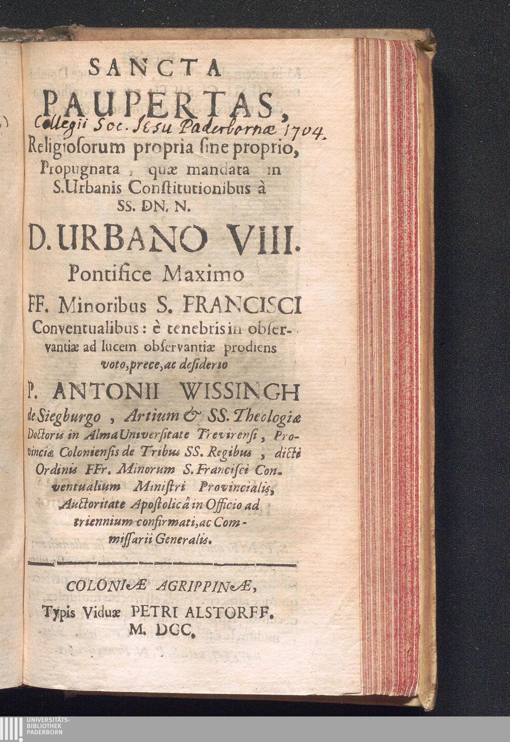 Sancta Paupertas Religosorum propria sine proprio Propugnata : quæ mandata in S. Urbanis Constitutionibus à SS. DN. N. Urbano VIII. Pontifice Maximo ... / e tenebris in observantiæ ad lucem observantiae prodiens voto, prece, ac desiderio P. Antonii Wissingh de Siegburgo, ...