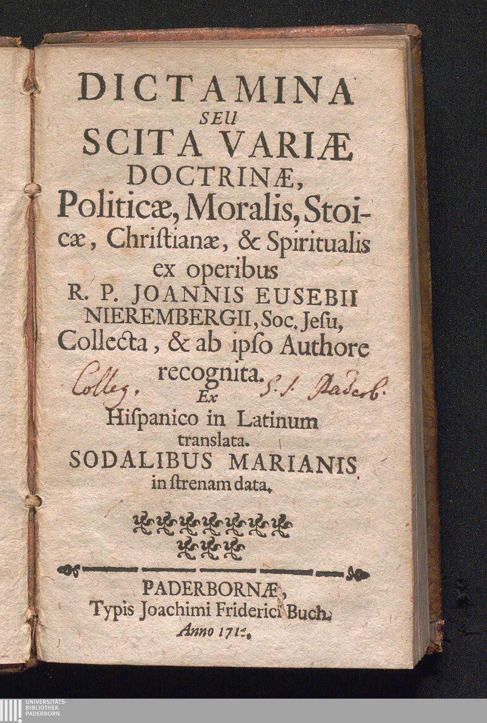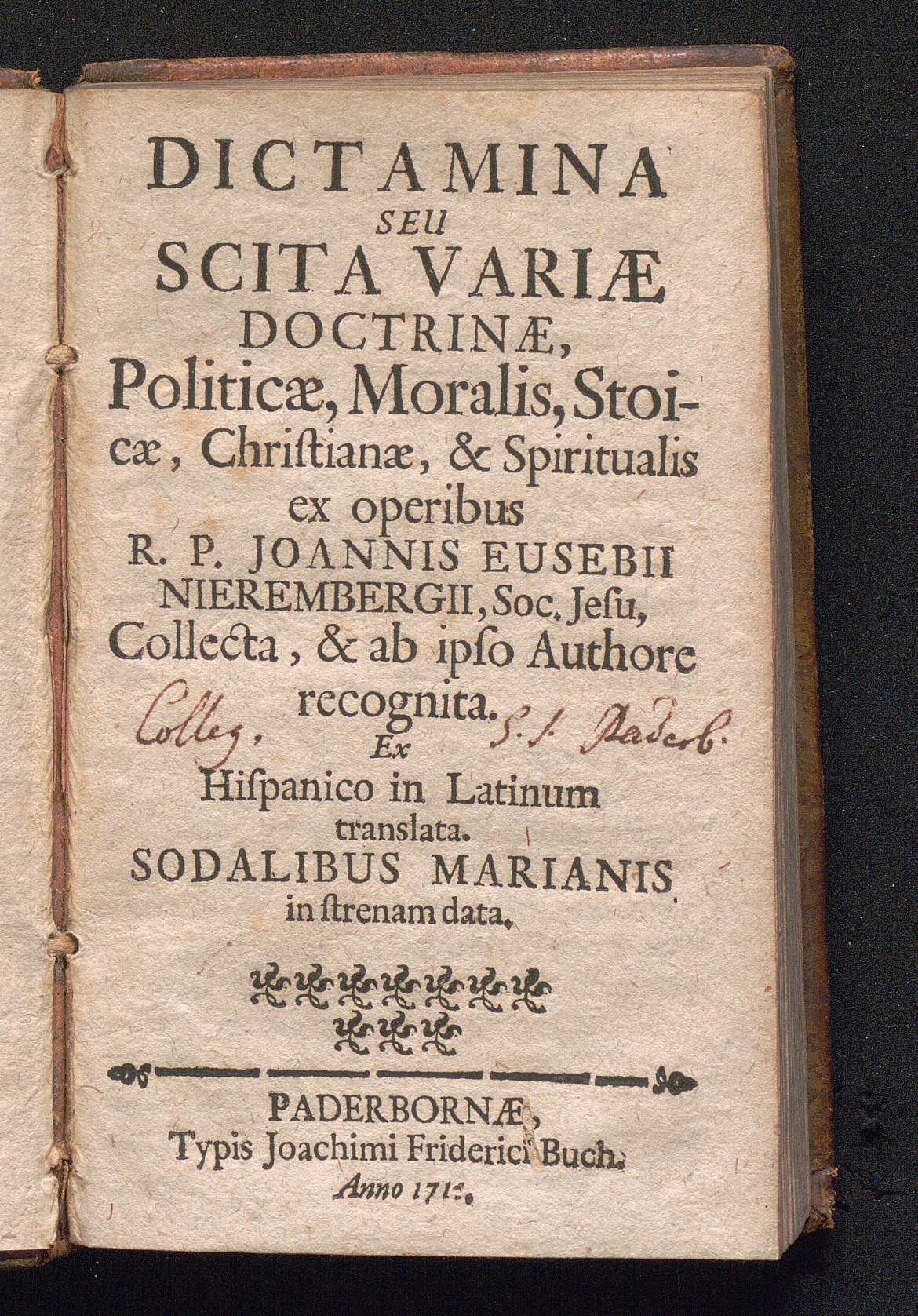 Dictamina Seu Scita Variæ Doctrinæ, Politicæ, Moralis, Stoicæ, Christianæ, & Spiritualis : Ex operibus R.P. Joannis Eusebii Nierembergii, Soc. Jesu, Collecta, & ab ipso Authore recognita ; Ex Hispanico in Latinum translata. Sodalibus Marianis in strenam data