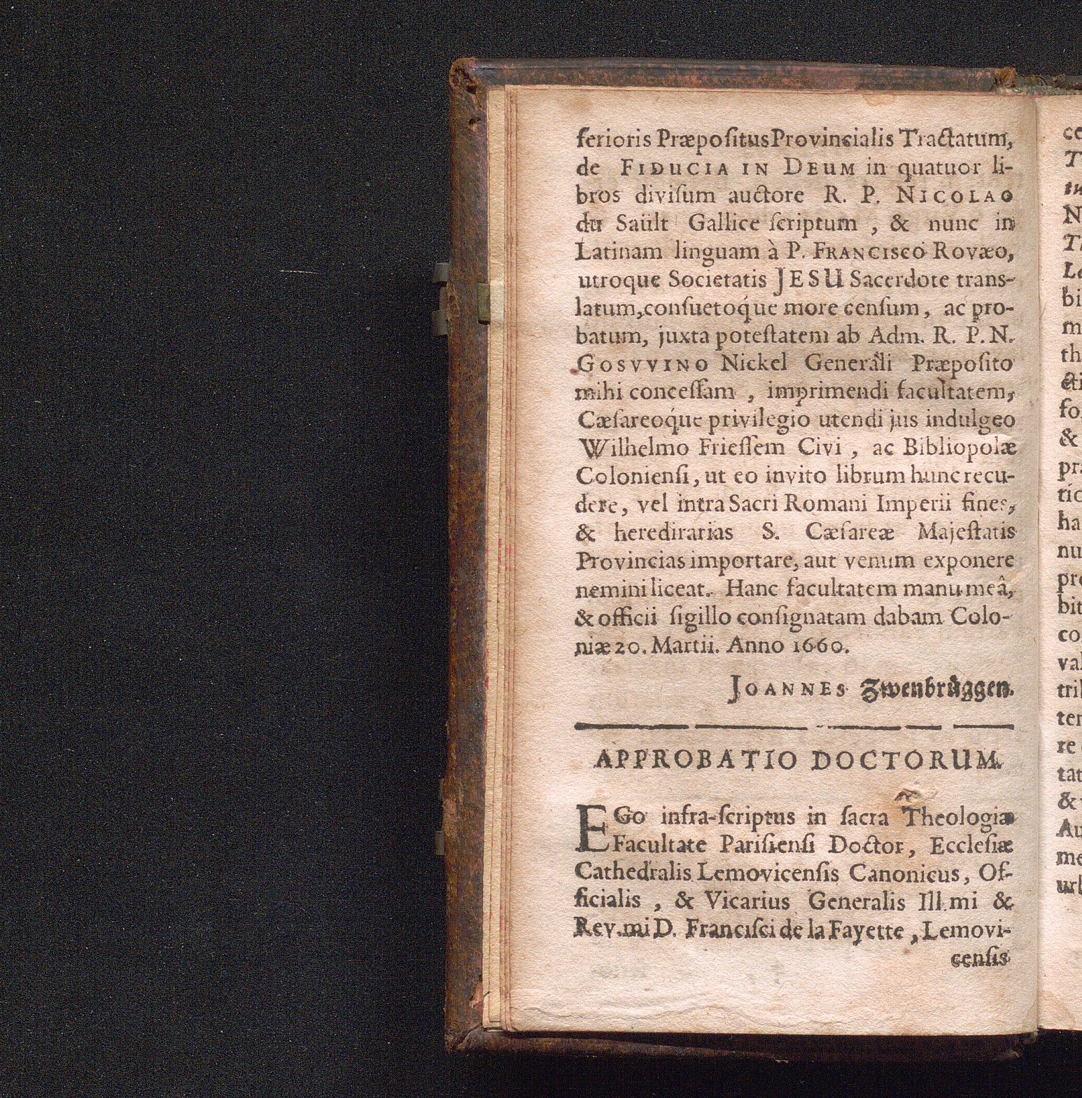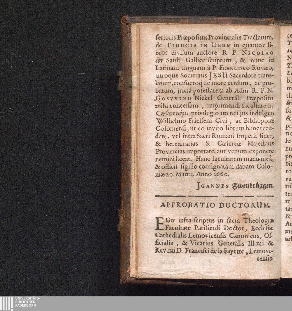 Tractatvs De Fiducia In Devm Plurimas Et Utilissimas pro vitâ spirituali instructiones Continens, Præcipue Ad Obtinendam magnam animæ quietem, & afflictiones quascunque ingenti cum solatio & fructu perferendas : In Libros IV Divisus / à R.P. Nicolao du Sault Soc. Jesu quondam Gallicè scriptus Latinè redditus à R.P. Francisco Rovæo ejusdem Societatis Sacerdote