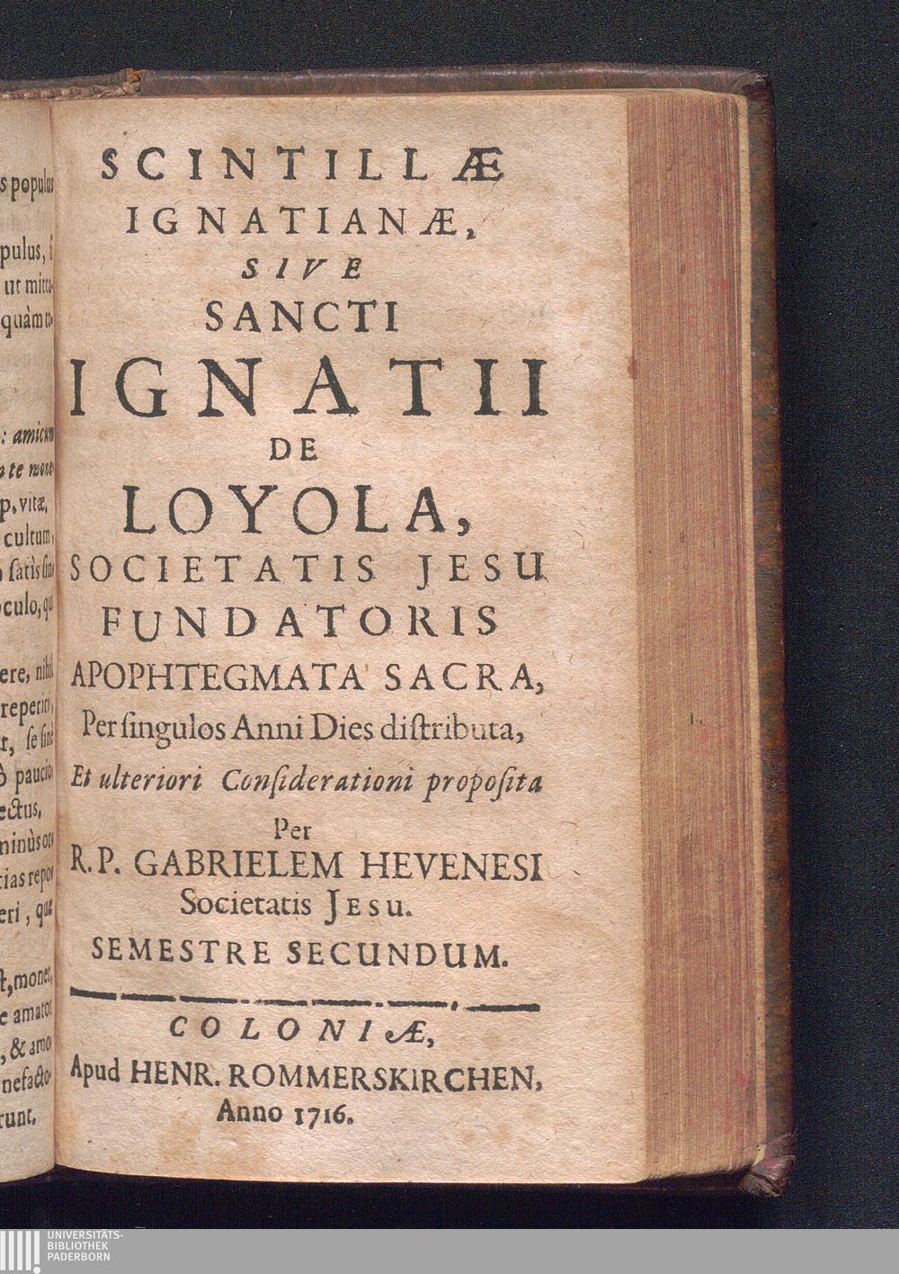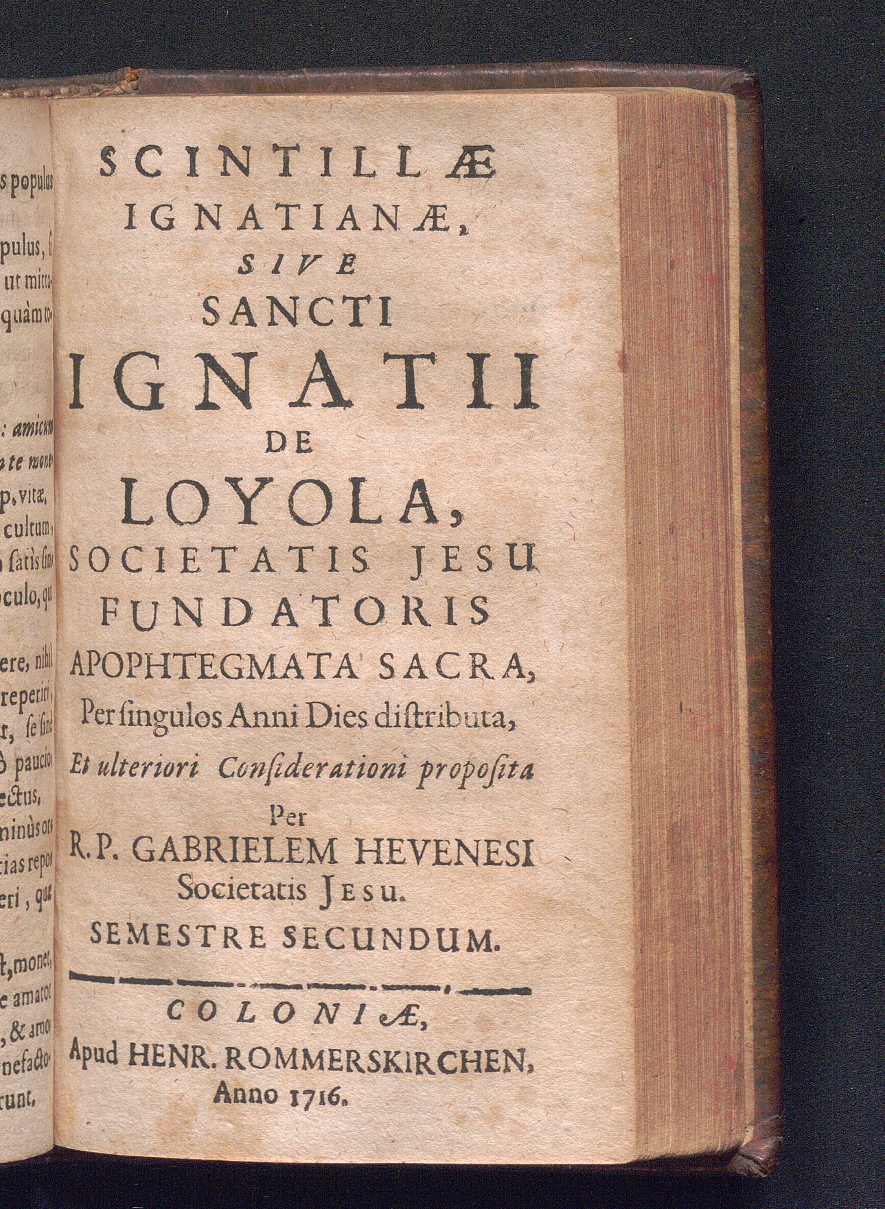 Scintillæ Ignatianæ, Sive Sancti Ignatii De Loyola, Societatis Jesu Fundatoris Apophthegmata Sacra / Per singulos Anni Dies distributa, Et ulteriori Considerationi proposita Per Gabrielem Hevenesi Societatis Jesu