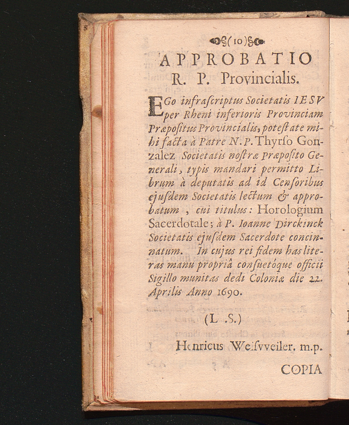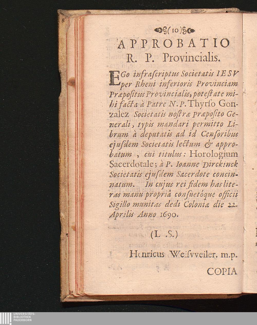 Horologivm Sacerdotale Sacerdotibus tam Ecclesiasticis, quàm Religiosis, præsertim Neomystis Ordinem diei, & praxes indicans Opera quotidiana exactè, sanctéque obeundi / Concinnatum à R. P. Joanne Dirckinck S. J.