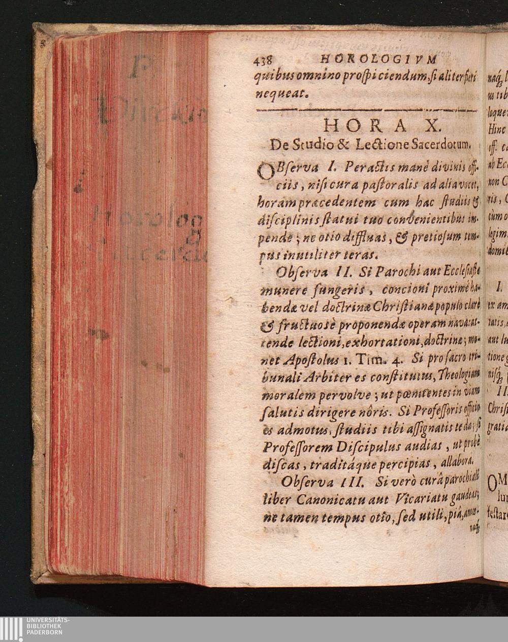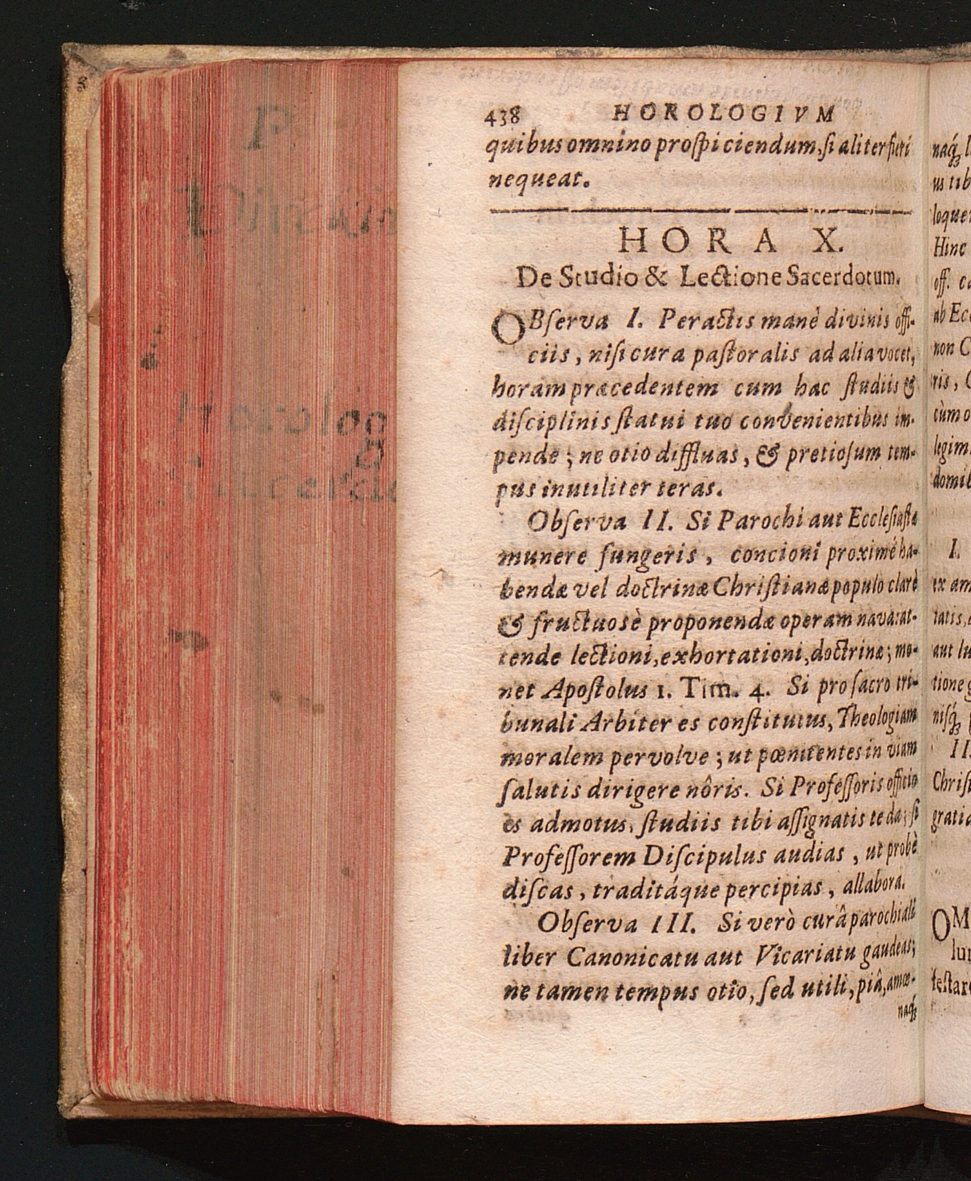 Horologivm Sacerdotale Sacerdotibus tam Ecclesiasticis, quàm Religiosis, præsertim Neomystis Ordinem diei, & praxes indicans Opera quotidiana exactè, sanctéque obeundi / Concinnatum à R. P. Joanne Dirckinck S. J.