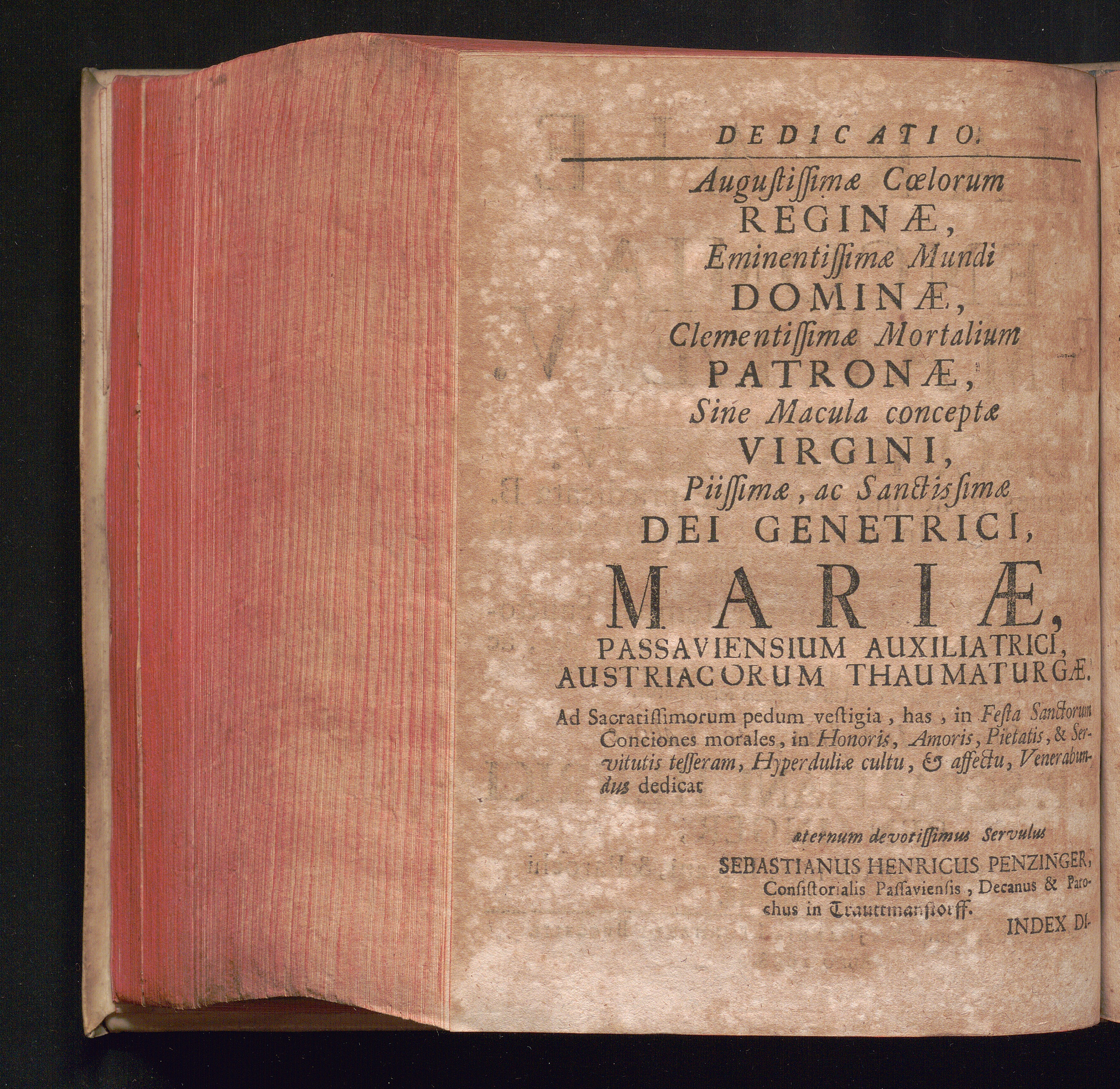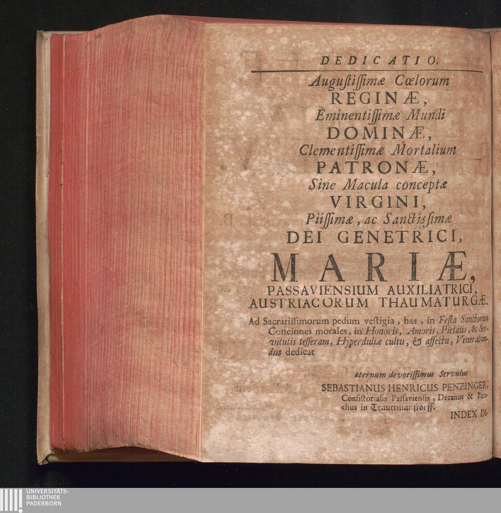 R. P. Sebastiani Henrici Penzingeri, Consistorialis Passaviensis, Decani, & Parochi in Trauttmanstorff ad Laitam Bonus Ordo Triplicis Formatæ Concionis Moralis In Omnia Festa Sanctorum In Amplissima Diœcesi Passaviensi celebria per totum Annum : In Exordio Thema assumptum, SS. Patrum nervosis verbis, ac Dictis, ut inconcussis Veritatis columnis fulcitur; In Confirmatione Conceptus elegantissimi adferuntur; Epilogus, aut Sacræ Scripturæ, aut alicujus S. Patris sententiâ concluditur. In Fine accessêre Encomia B. Mariæ Virginis Discursibus quadraginta quatuor constantia : In bonum usum eorum vel maximè, qui copiâ librorum carent, vel multa legendi otium non habent. Cum Indice locupletissimo Thematum rerumque memorabilium