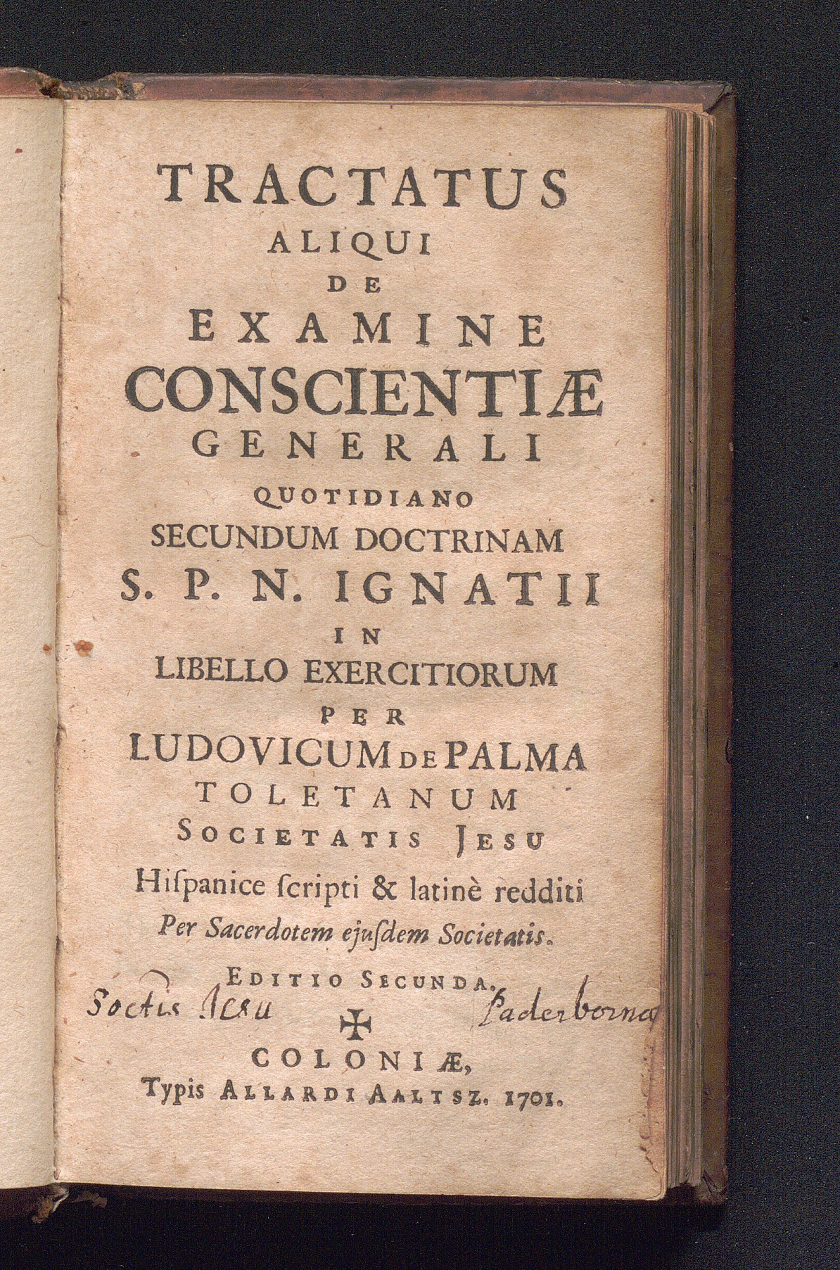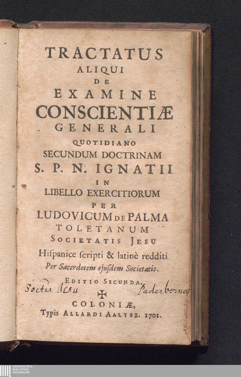 Tractatus Aliqui De Examine Conscientiæ Generali Quotidiano Secundum Doctrinam S. P. N. Ignatii In Libello Exercitiorum / Per Ludovicum De Palma Toletanum Societatis Jesu Hispanice scripti & latinè redditi Per Sacerdotem ejusdem Societatis