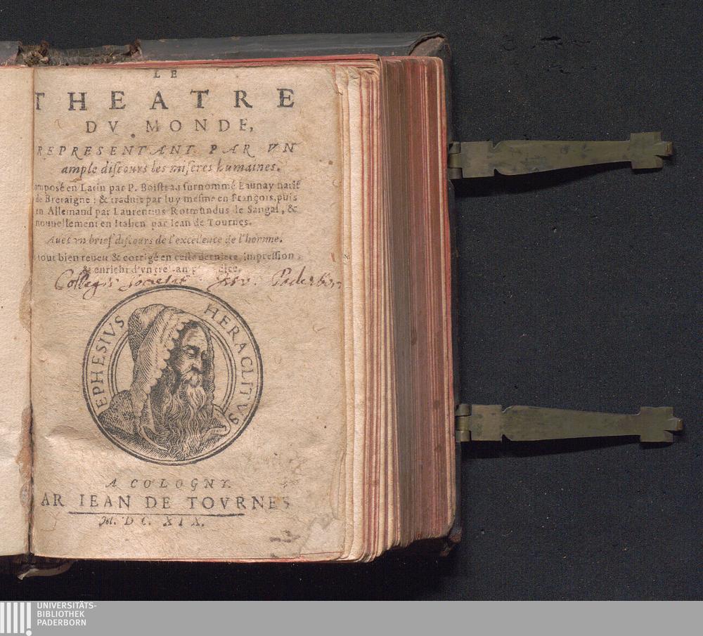 Le Theatre Dv Monde, Representant Par Vn ample discours les miseres humaines / Composé en Latin par P. Boisteau surnomme Launay natif de Bretaigne: & traduit par luy mesme en François, puis en Allemand par Laurentius Rotmundus de Sangal, & nouvellement en Italien par Jean de Tournes