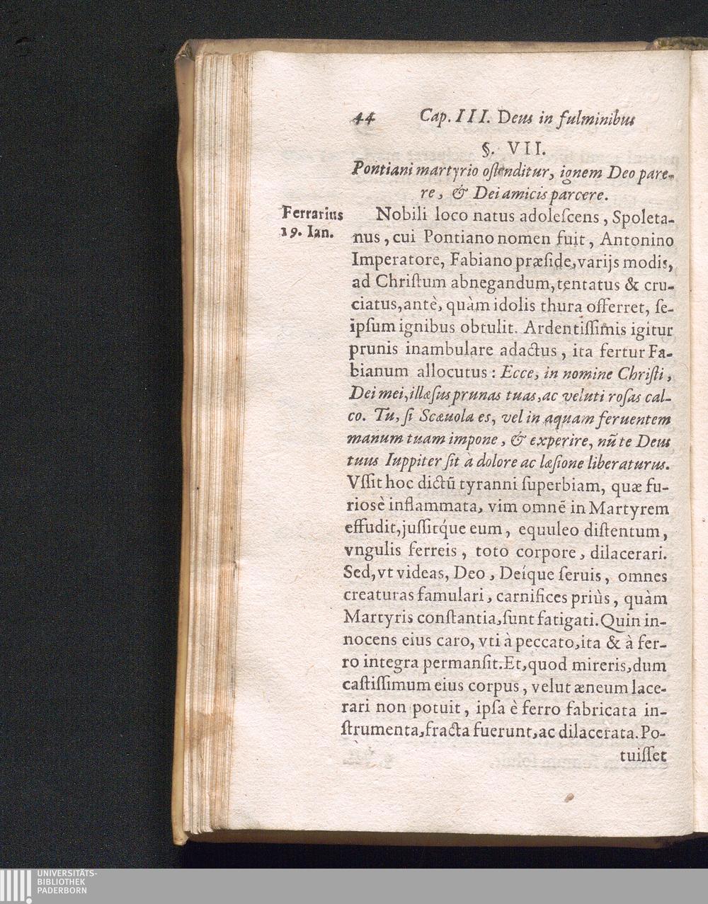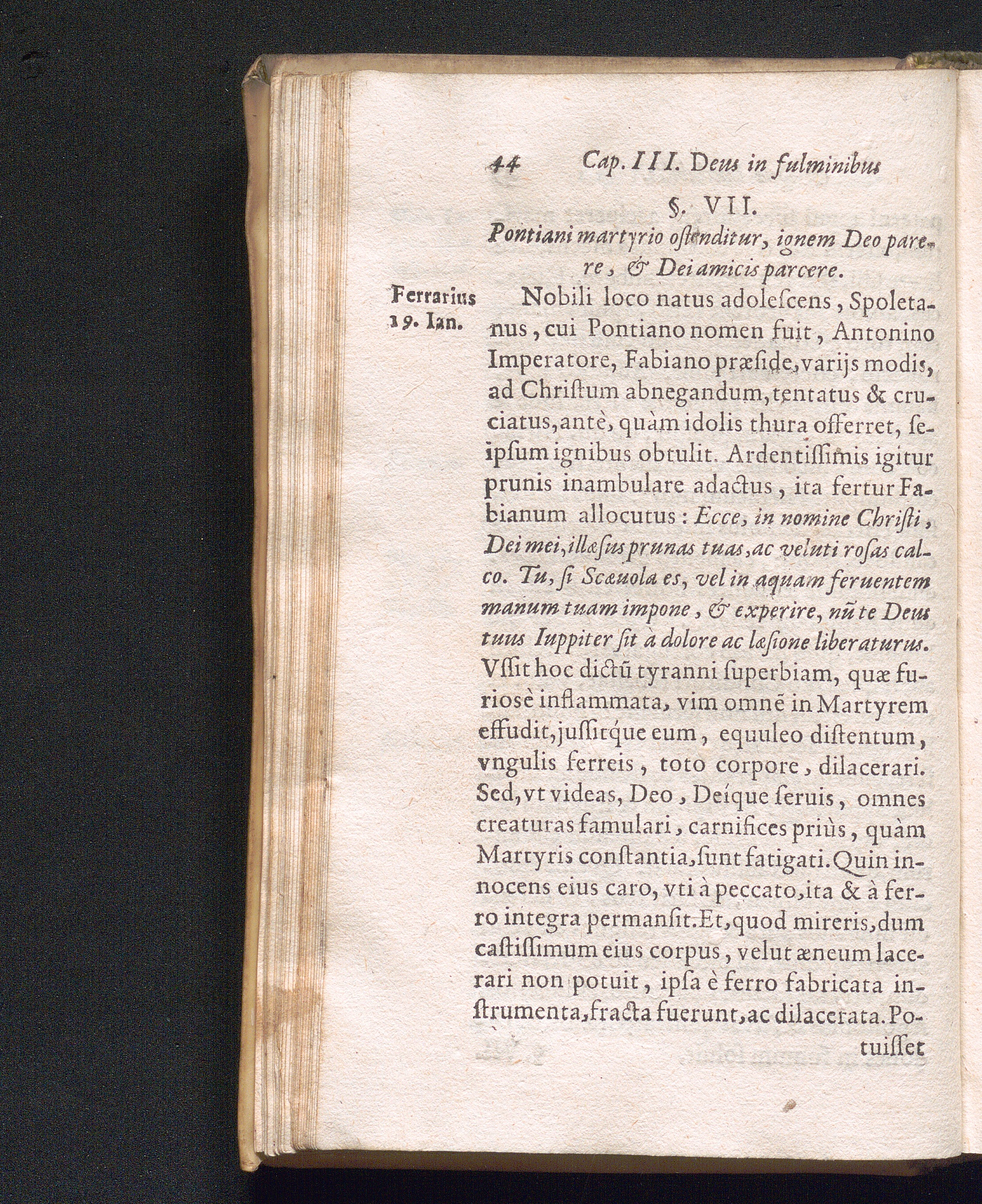 §. 7. Pontiani martyrio ostenditur, ignem Deo parere, & dei amicis parcere.