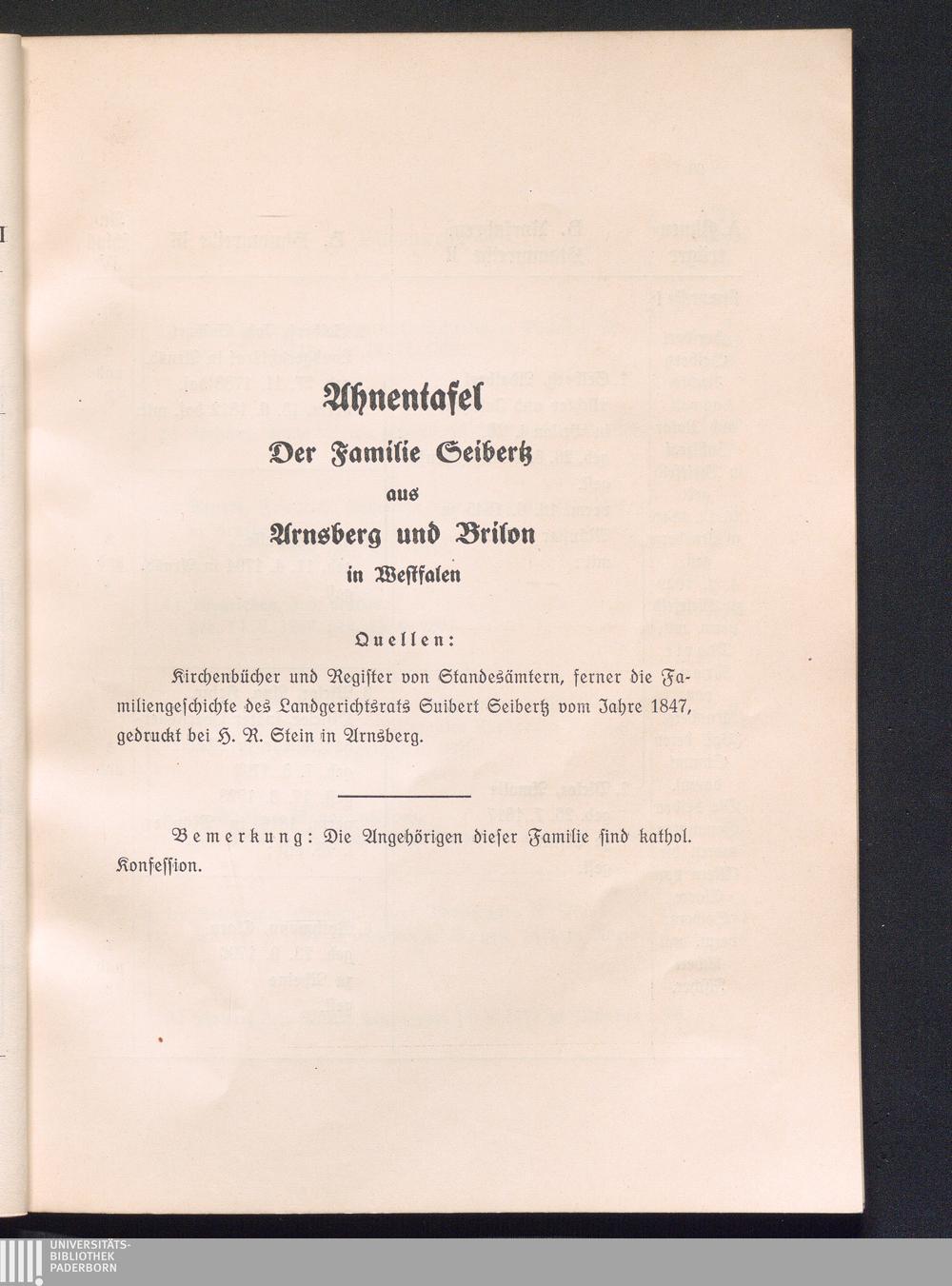 Ahnentafel Der Familie Seibertz aus Arnsberg und Brilon in Westfalen