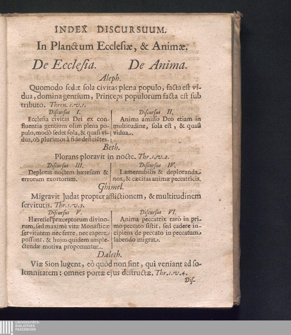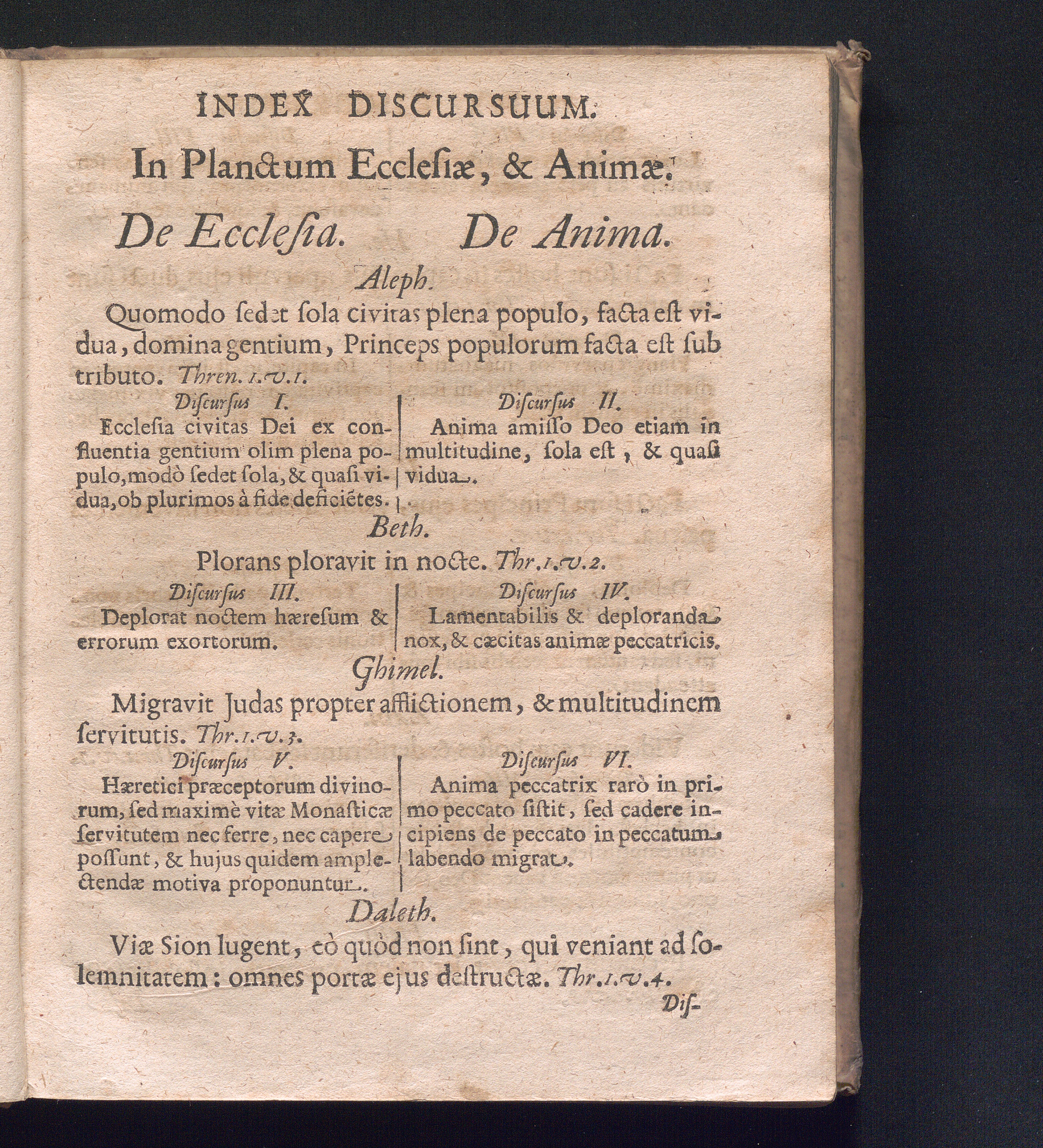 IV. (1680) Planctvs Ecclesiæ Et Animæ : Super Caput Primum Lamentationum Jeremiæ Prophetæ. Allegorice, Et Moraliter Expositus, & Distributus In Discursus LII. Concionatorios Quadragesimales ... ; Scilicet Liber Vitæ, Et Excessvs Amoris ... / Per P. F. Franciscum Josephum Ex Busmanshausen Ord: FFr: Min: S. Francisci Capuccinorum Provinciæ Anterioris Austriæ