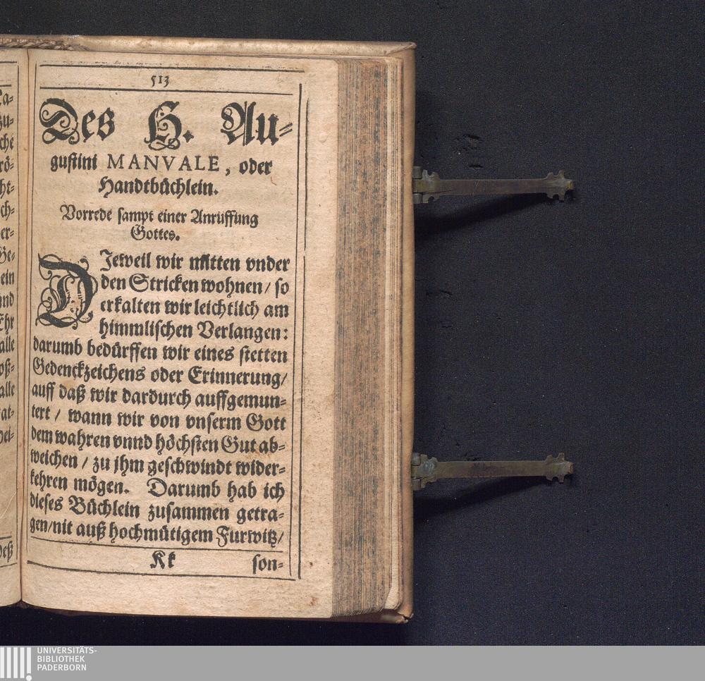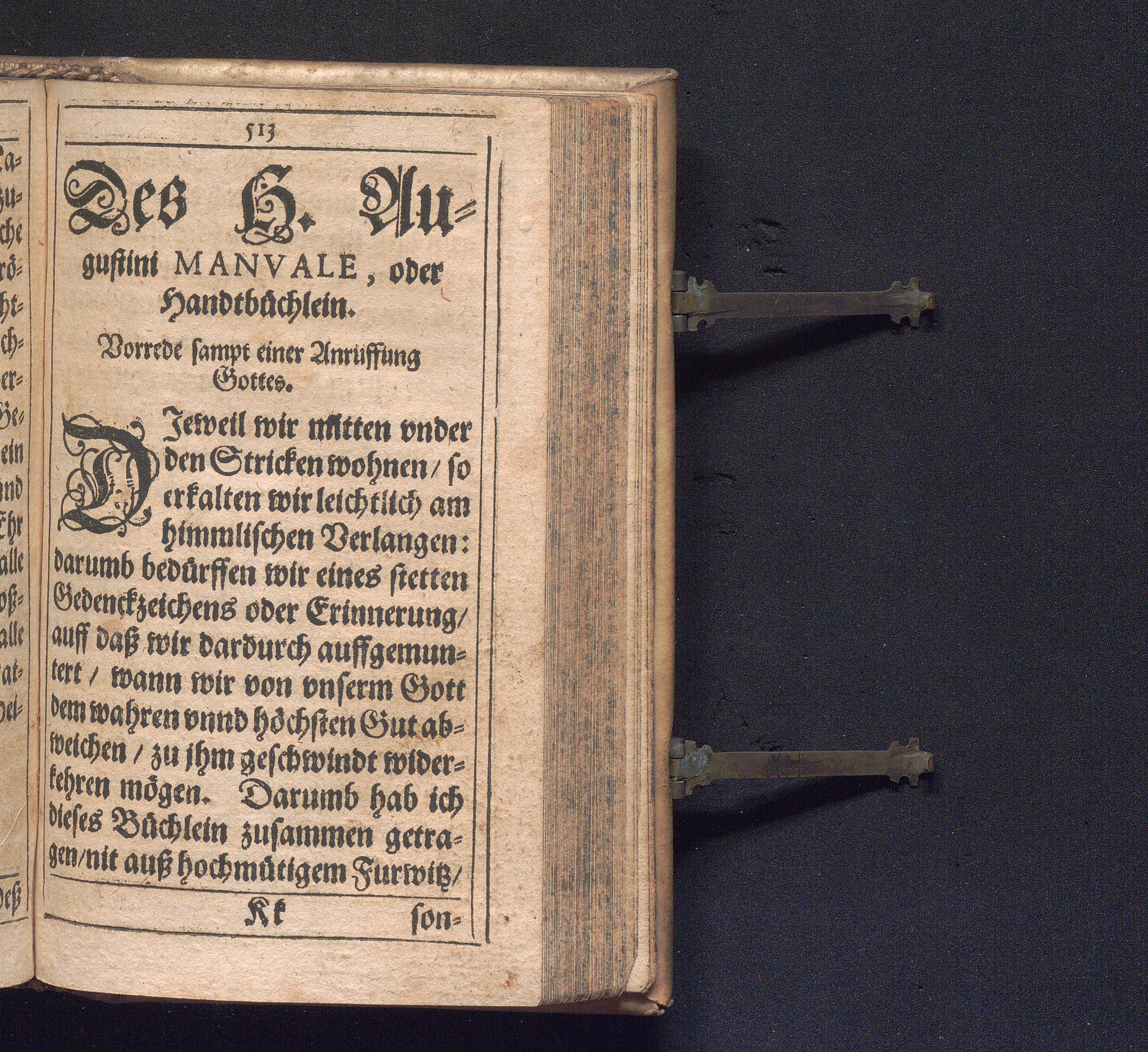 Drey Bucher des H. Augustini/ Meditationes, Soliloqvia vnd Manvale zu Latein genennt : Darinnen Christliche Catholische vnnd Andechtige Gebett vnnd Gottselige Betrachtungen begriffen / zu mehrung Geistlicher Andacht trewlich verteutscht/ durch den Würdigen Herrn Iohannem Schwayger/ vnser Lieben Frawen zu Franckfurt am Mayn Scholastern